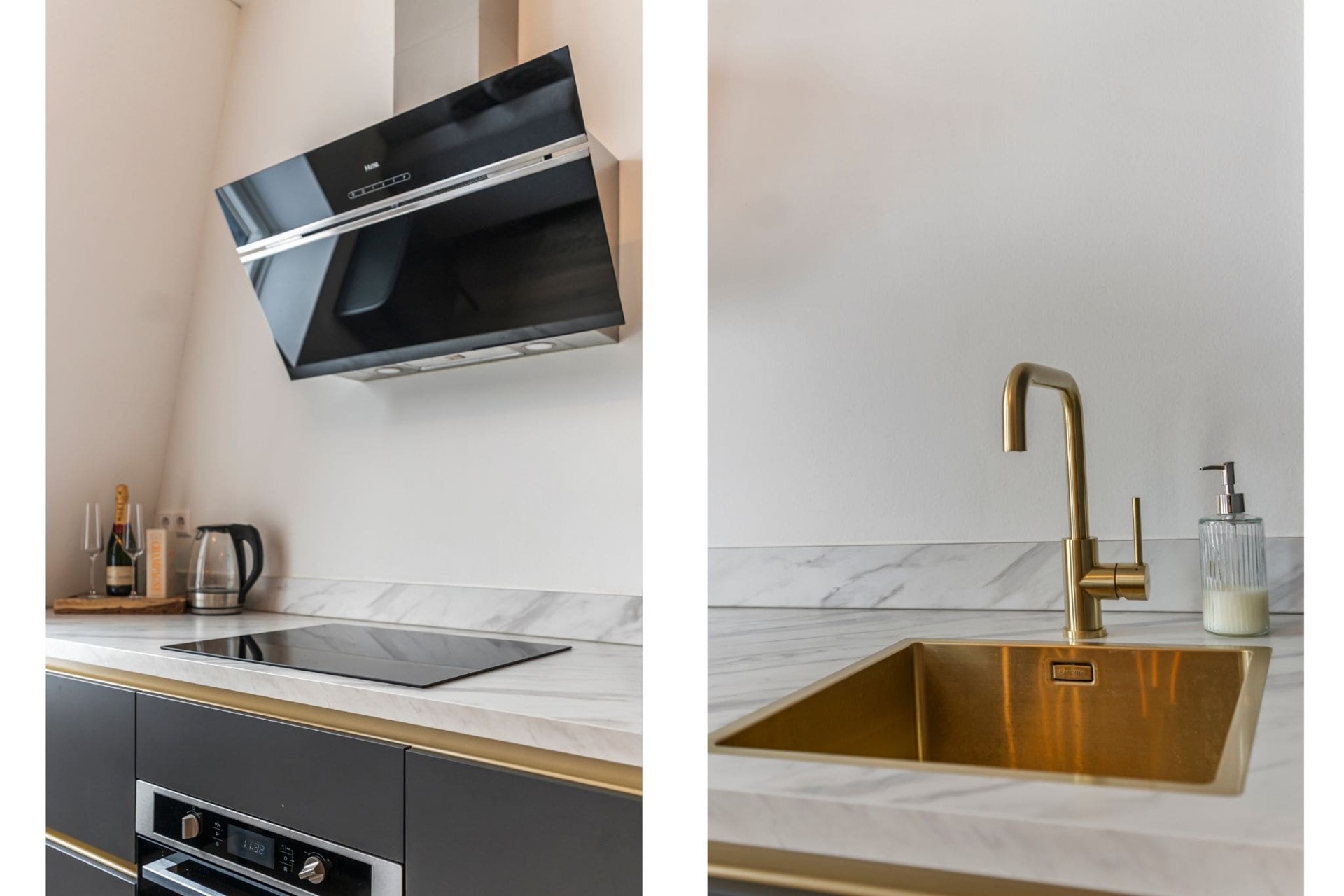De moderne open keuken heeft een luxe uitstraling en is voorzien van hoogwaardige inbouwapparatuur; een oven, inductiekookplaat met afzuigkap, koelvries combinatie, vaatwasmachine, luxe wasbak.