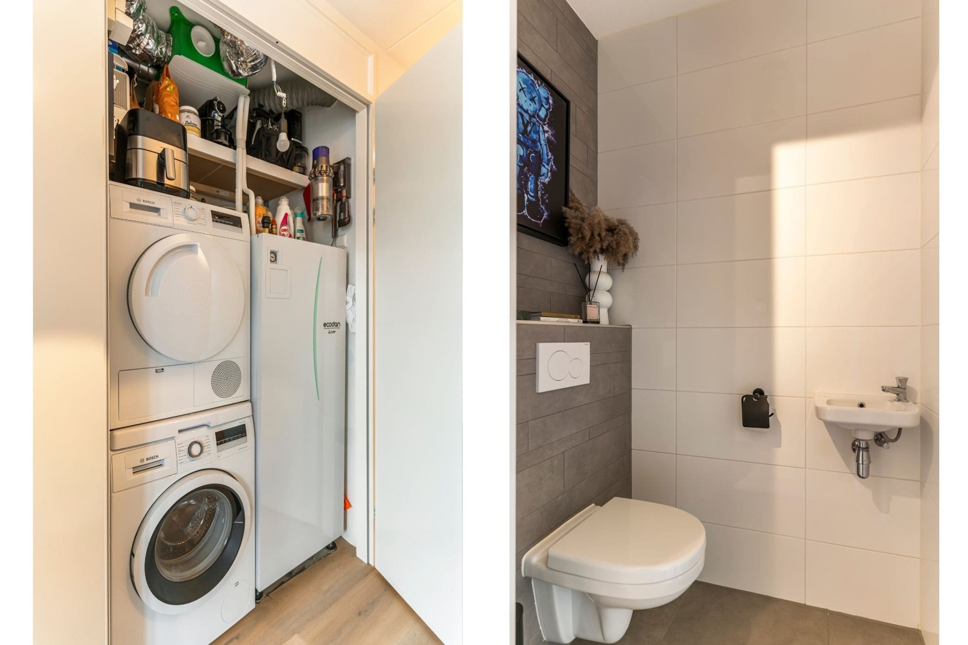 In de hal bevinden zich het separate toilet en de ruimte van de hybride warmtepomp en wasmachineaansluiting.
