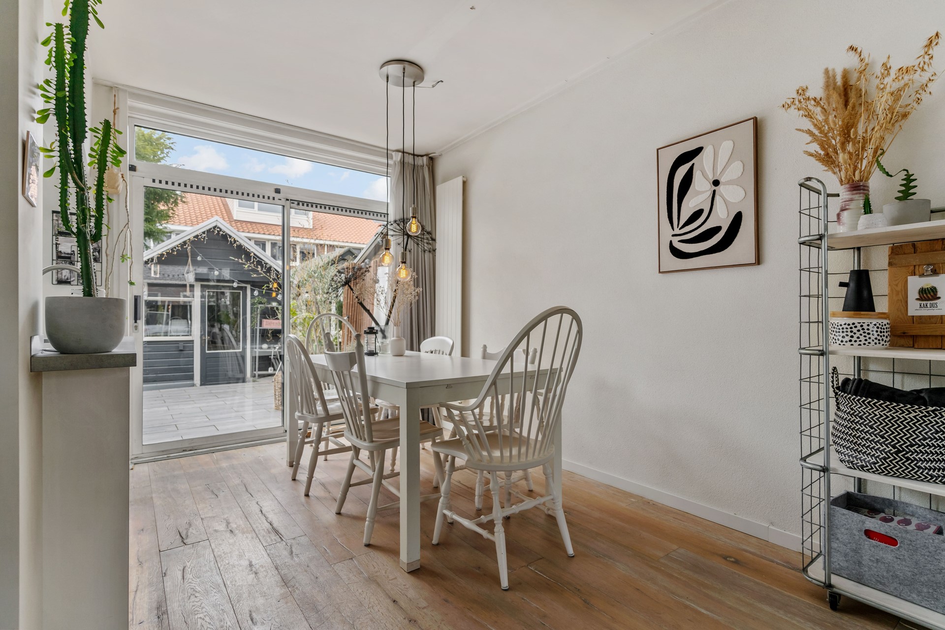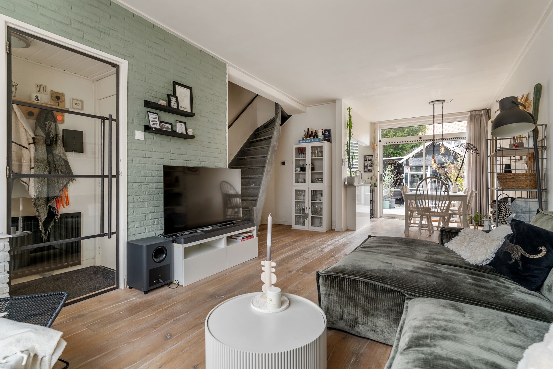 Stap binnen en merk meteen: aan lichtinval geen gebrek! De royale woonkamer biedt ruimte voor de gezellige zithoek en een lange eettafel – here’s where memories are made!