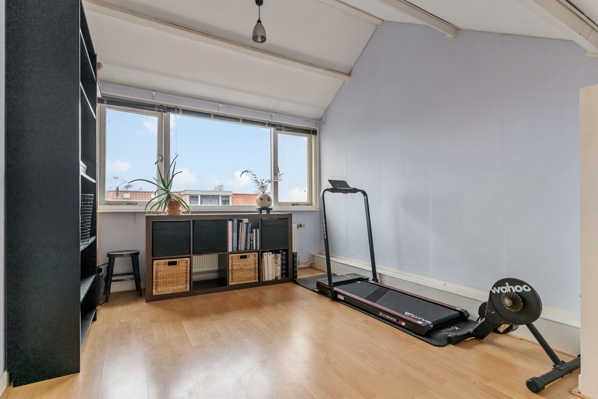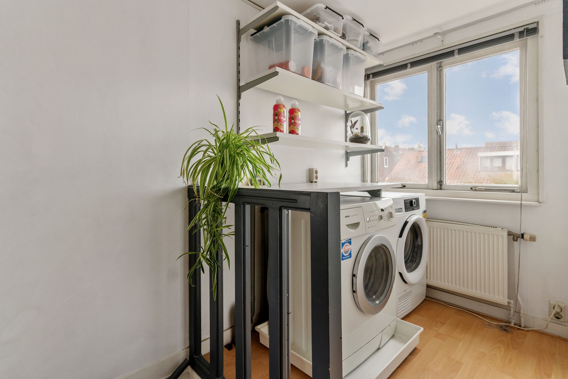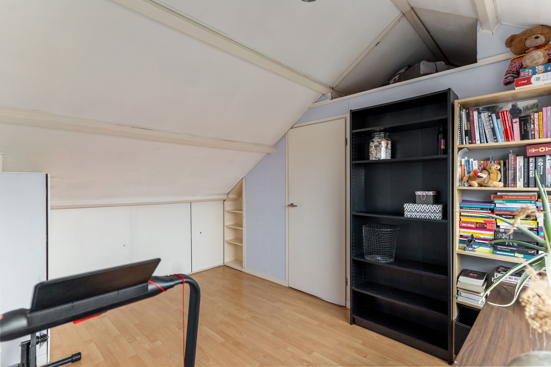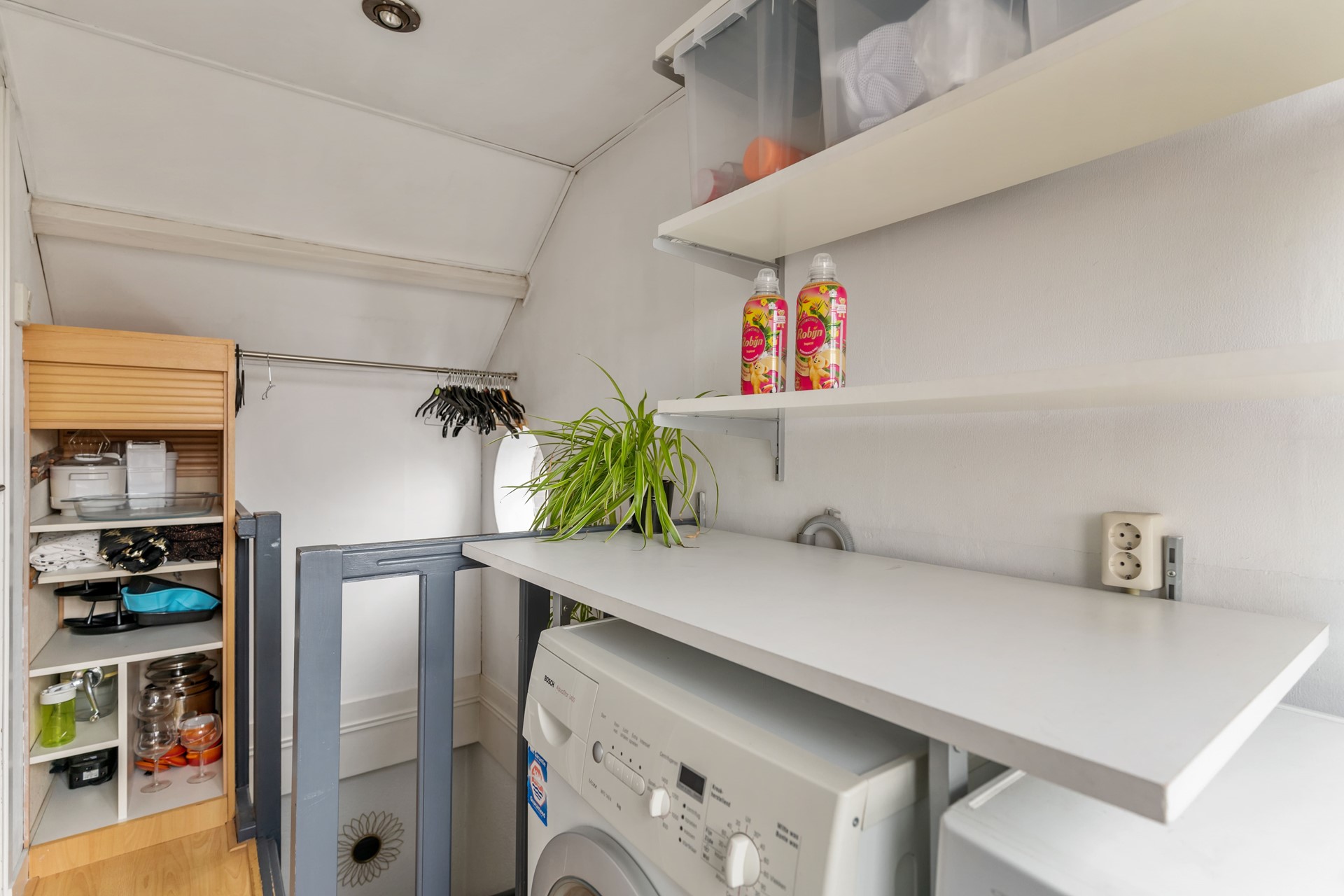 Aangekomen op de overloop van de zolderverdieping tref je de wasruimte en toegang tot de derde slaapkamer.