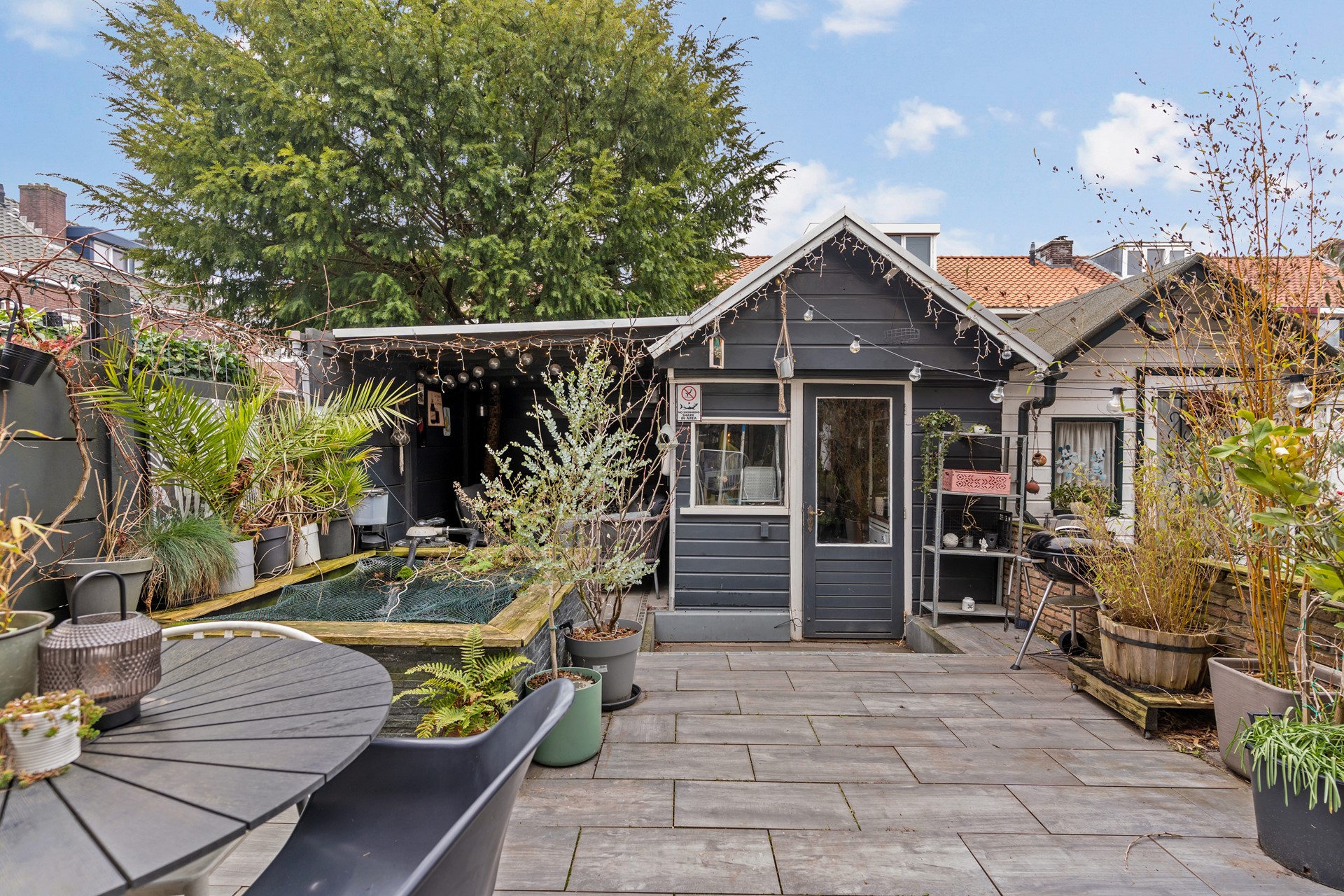 Grenzend aan de woonkamer ligt de zonnige achtertuin gelegen op het zuidwesten. Hier kunnen kinderen naar hartenlust spelen terwijl jij geniet van een goed boek op het terras of onder de veranda. Nog zo’n voordeel: omdat deze woning aan het einde van de rij staat, heb je nét wat meer privacy en een bredere achterom. De tuin is verzorgd aangelegd, gemakkelijk in onderhoud en voorzien van een vijvertje. De schuur biedt praktische bergruimte voor fietsen, tuinspullen en gereedschap.