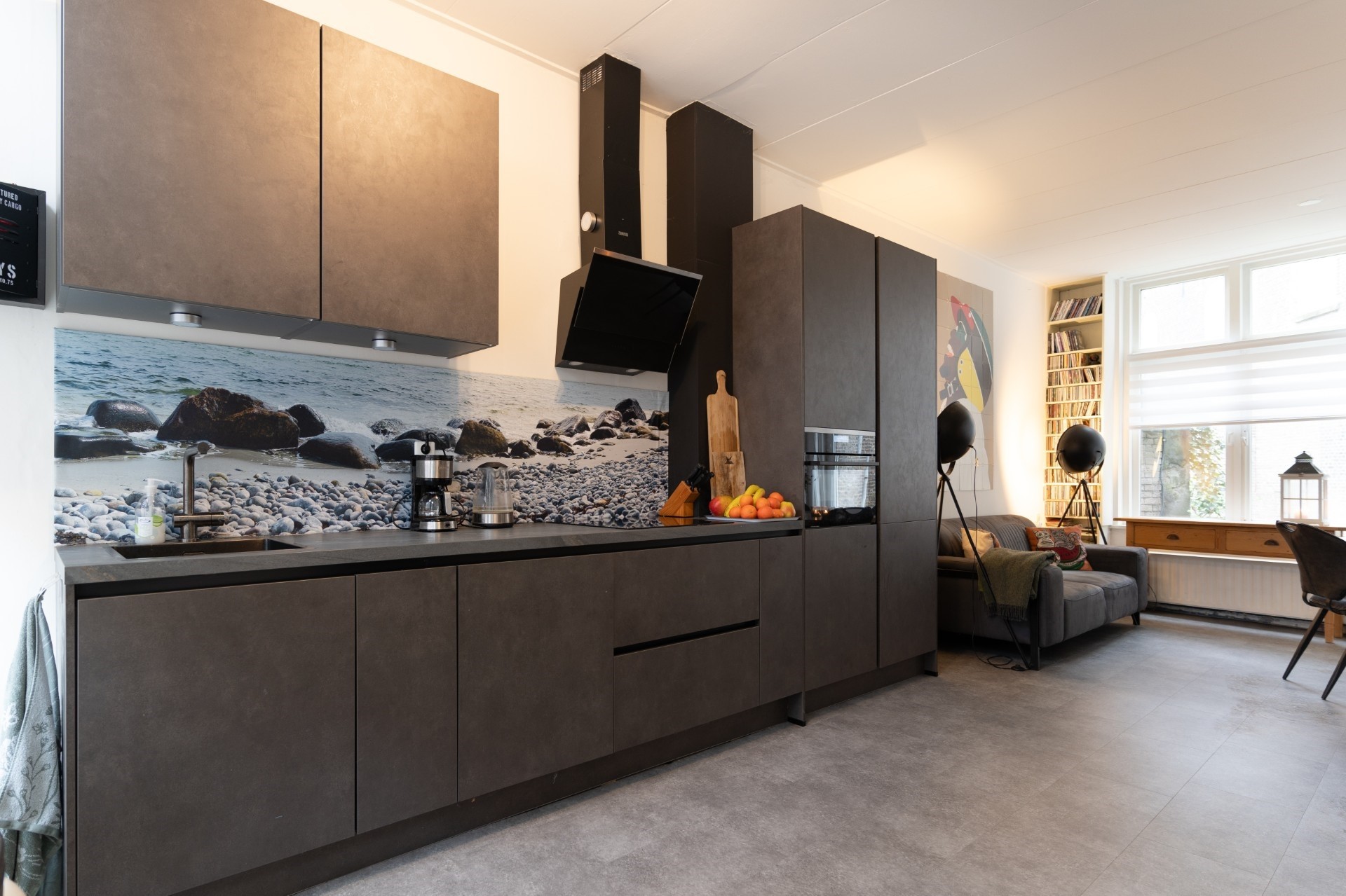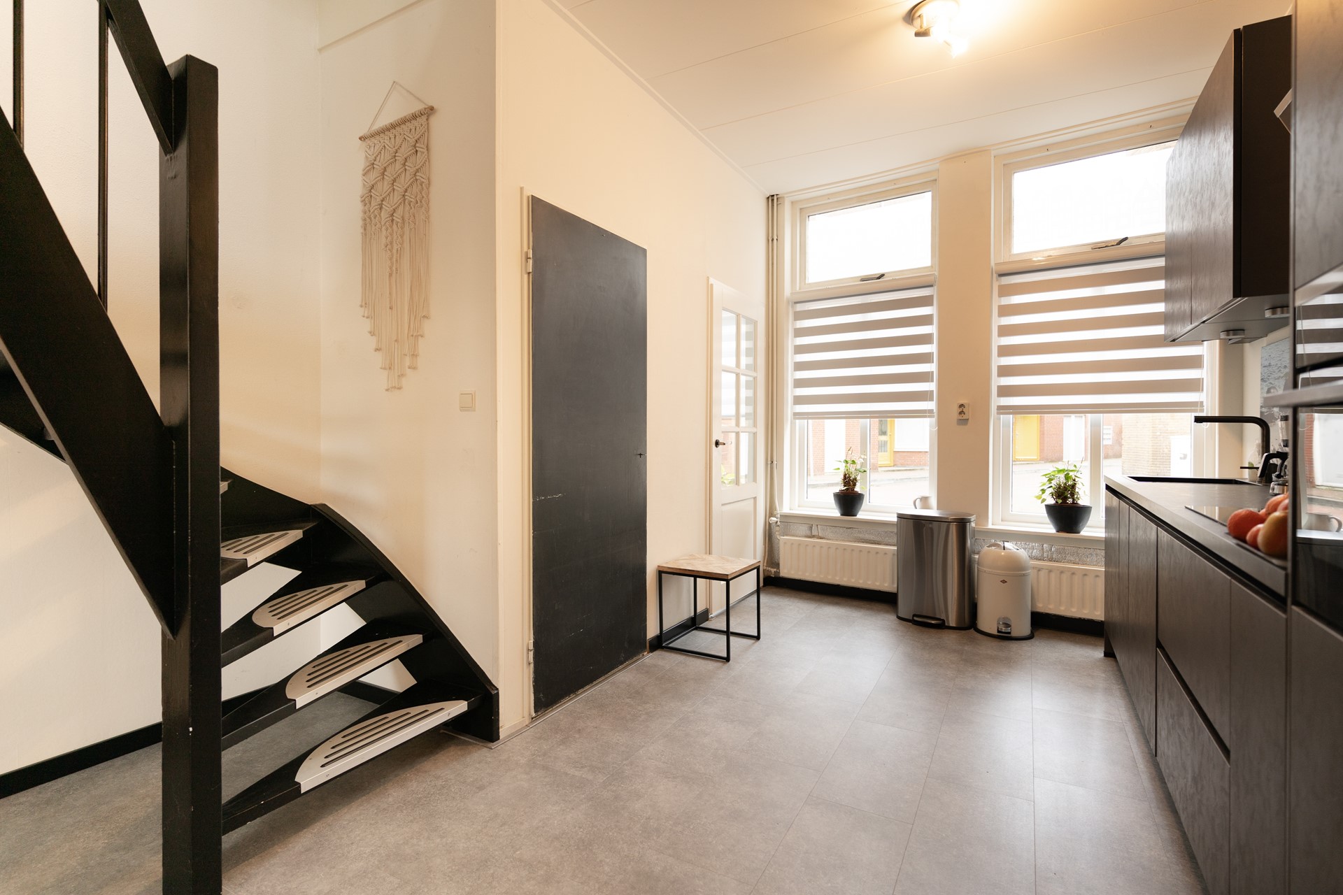 Bij binnenkomst in de hal wordt u verwelkomd door een lichte ruimte. Vanuit hier heeft u toegang tot het separate toilet en de ruime woonkamer, die door de grote ramen veel natuurlijk licht ontvangt en een open uitstraling heeft. De moderne open keuken aan de voorzijde is van alle gemakken voorzien, zoals een inductiekookplaat, ovencombinatie, afzuigsysteem, vaatwasser en koel-/vriescombinatie.