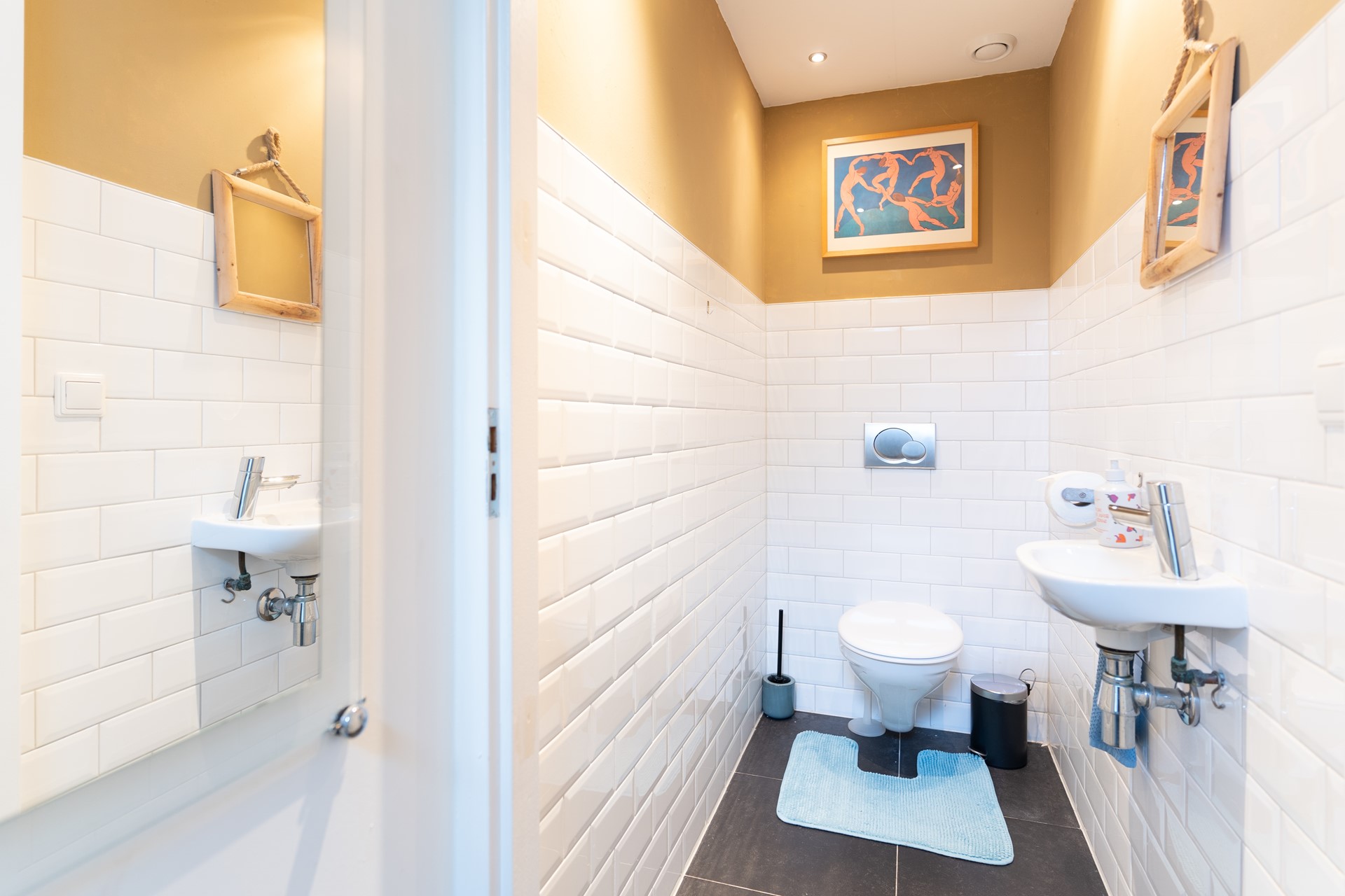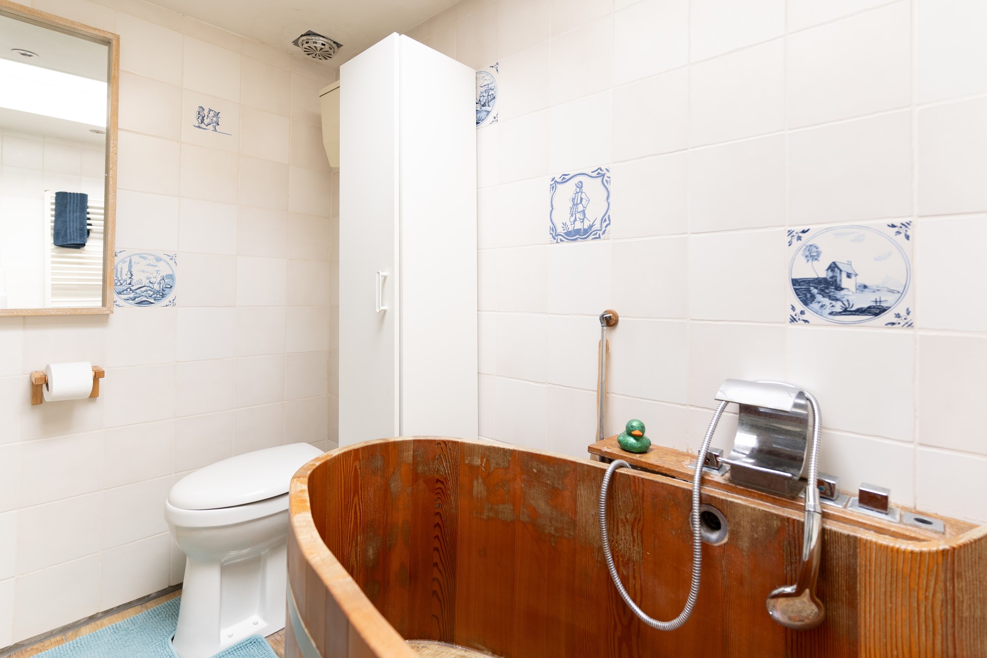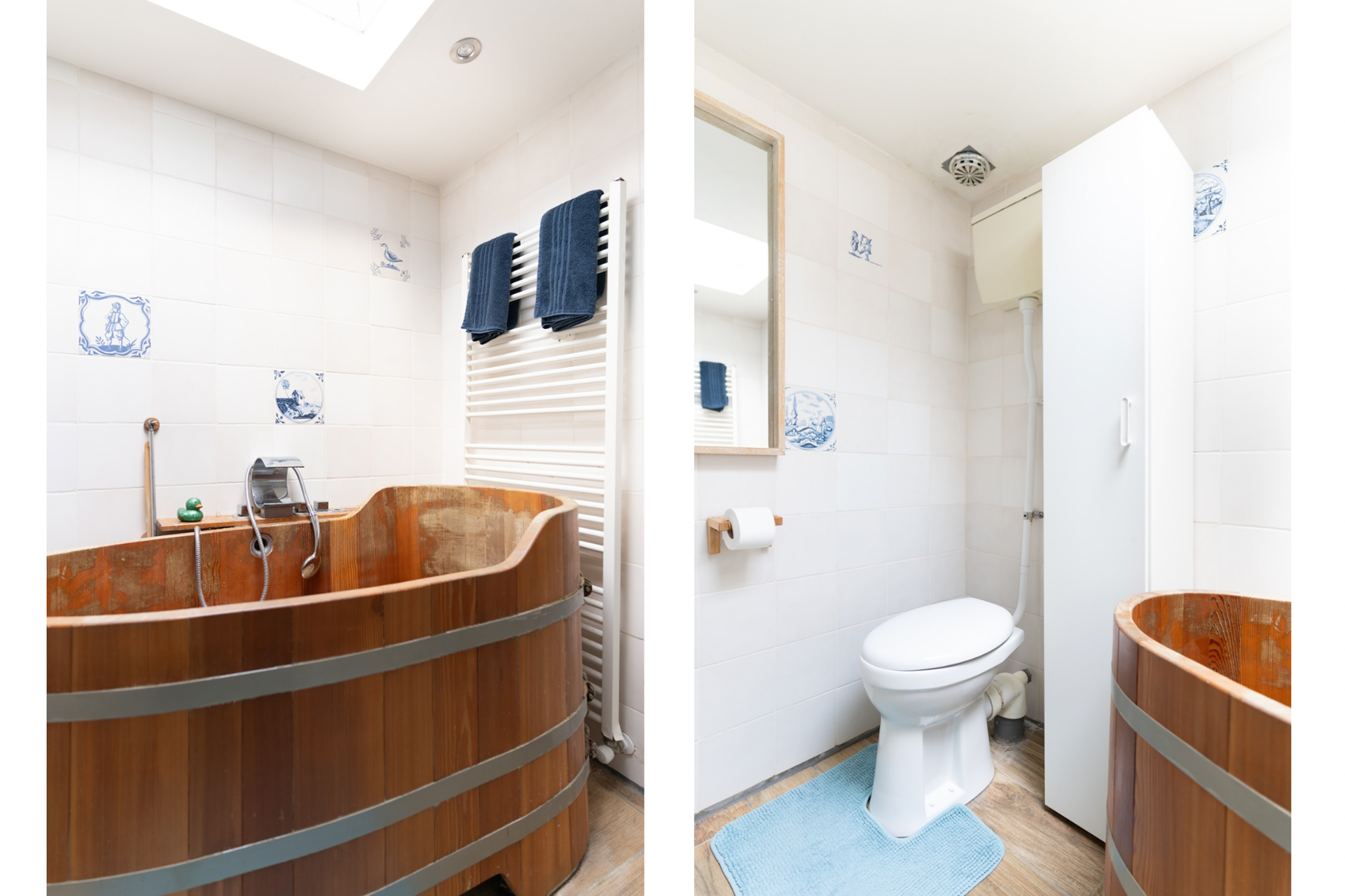 De badkamer heeft een vintage uitstraling en is voorzien van een vrijstaande badkuip en een tweede toilet. Dit biedt extra comfort en maakt de ruimte een fijne plek om tot rust te komen.