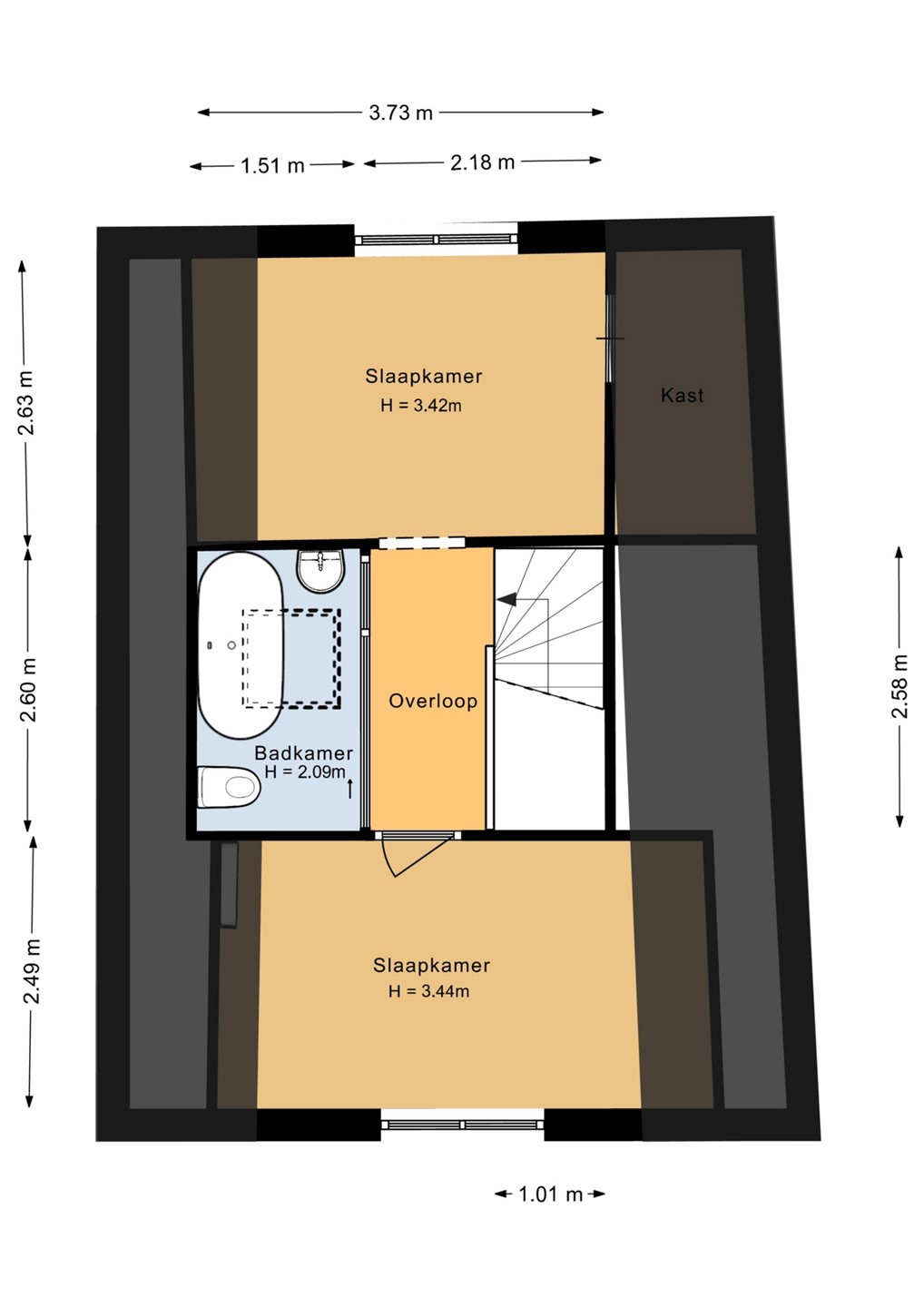Slaapkamer 1 (voorzijde woning): circa 3,73m x 2,49m.