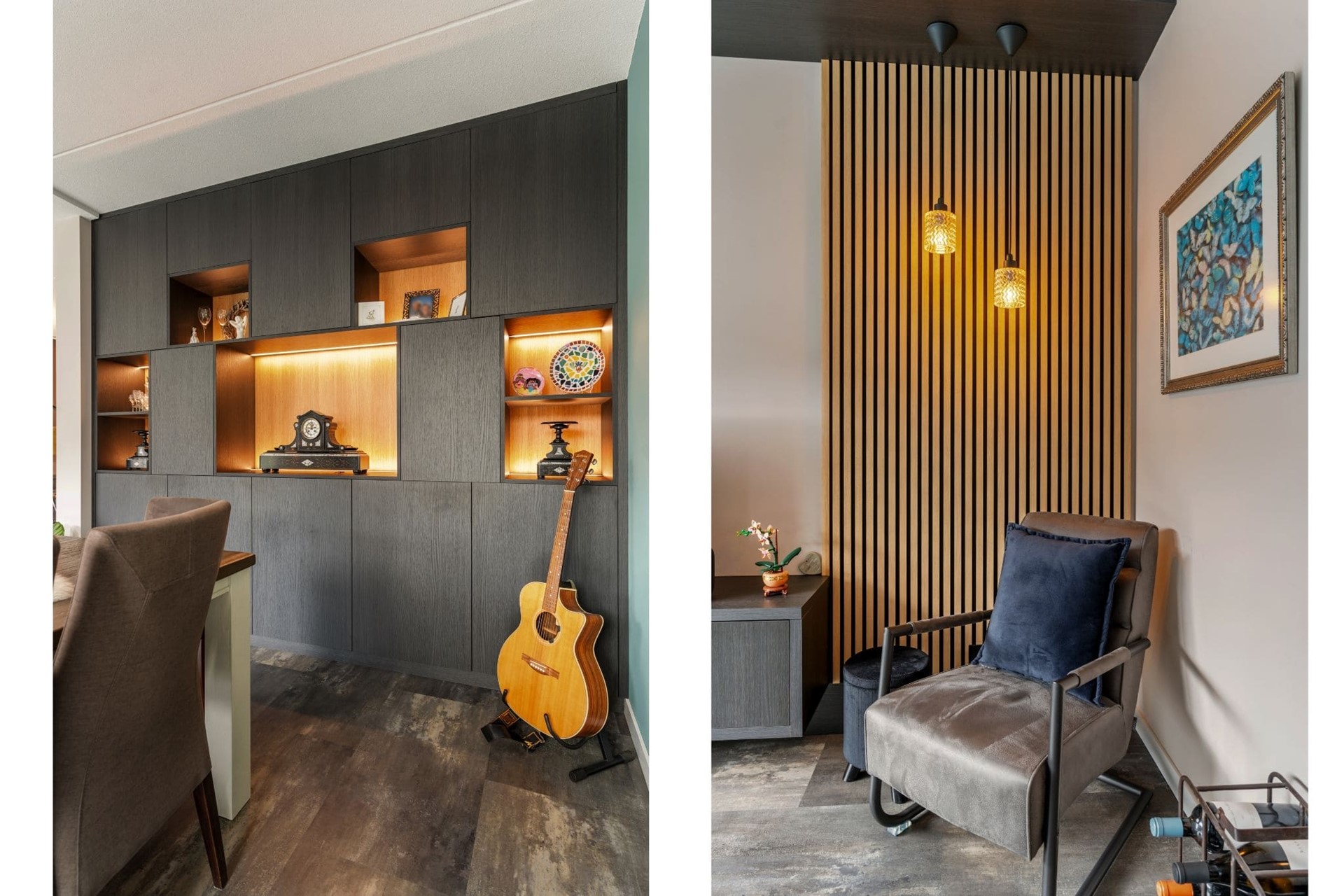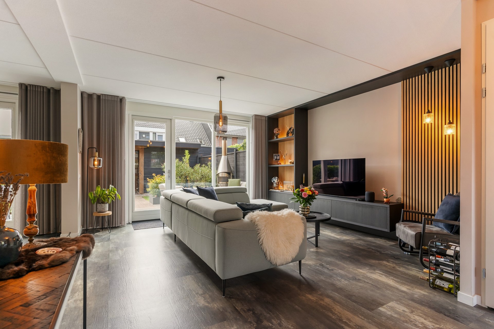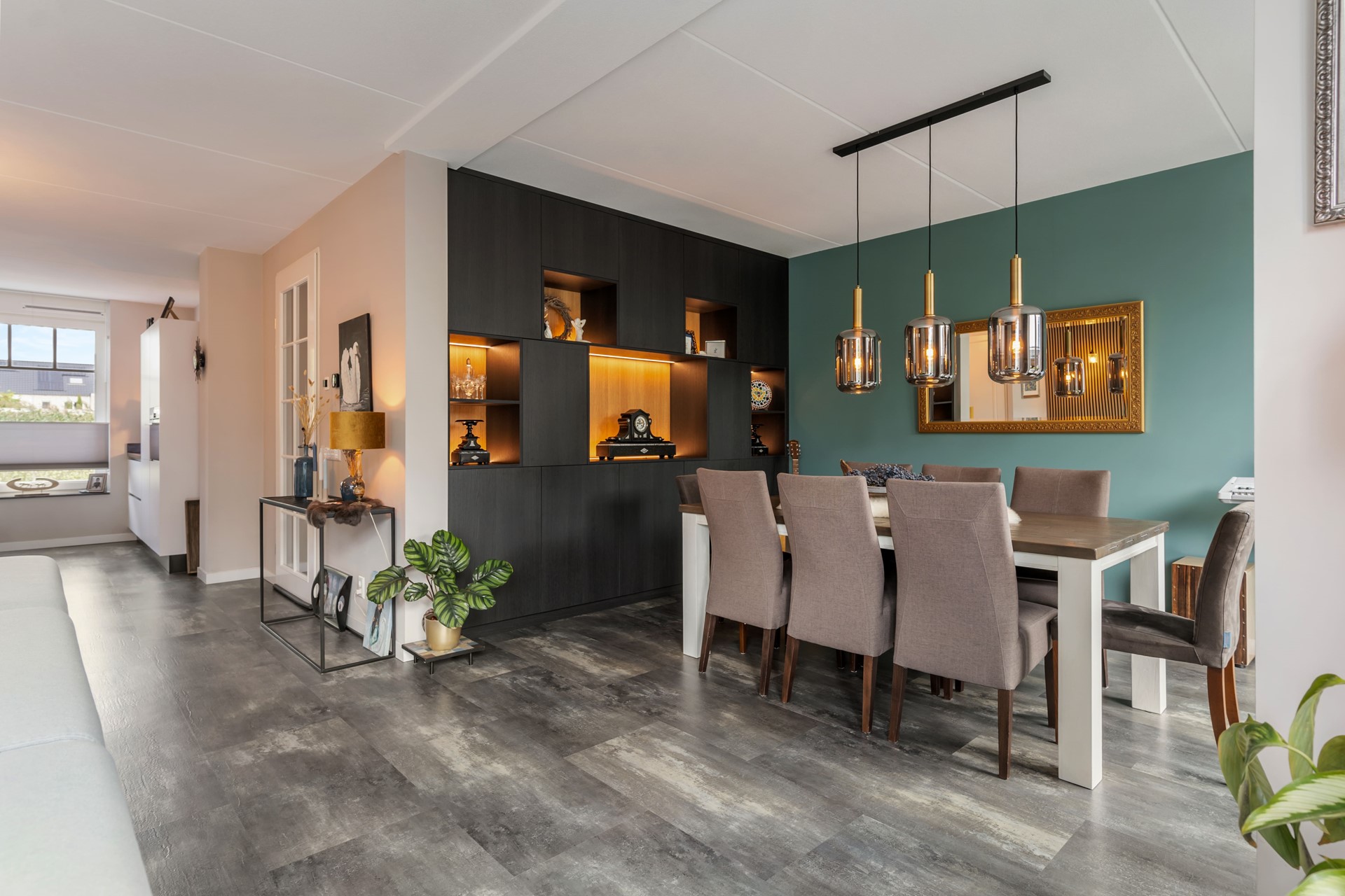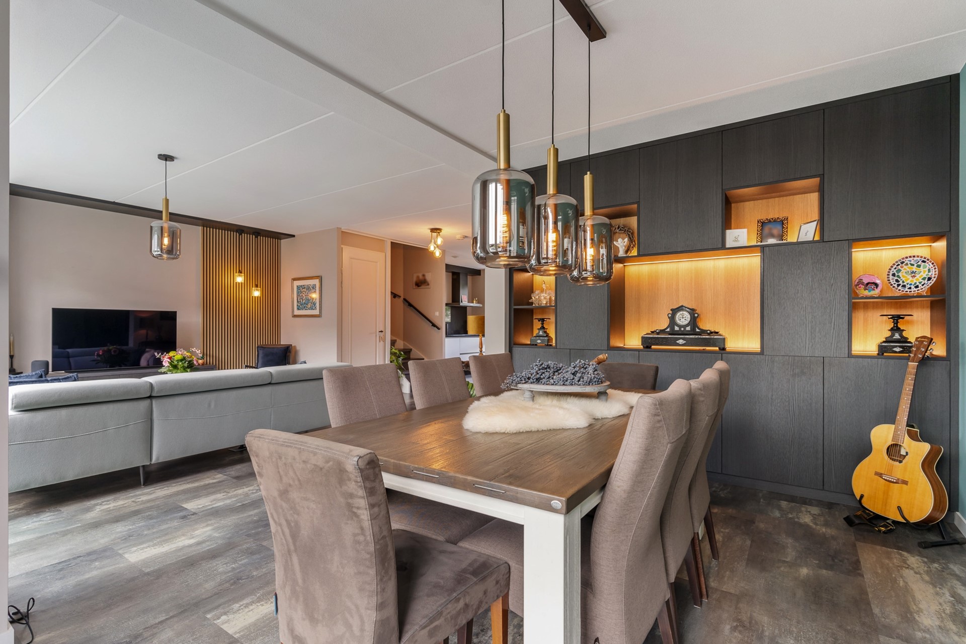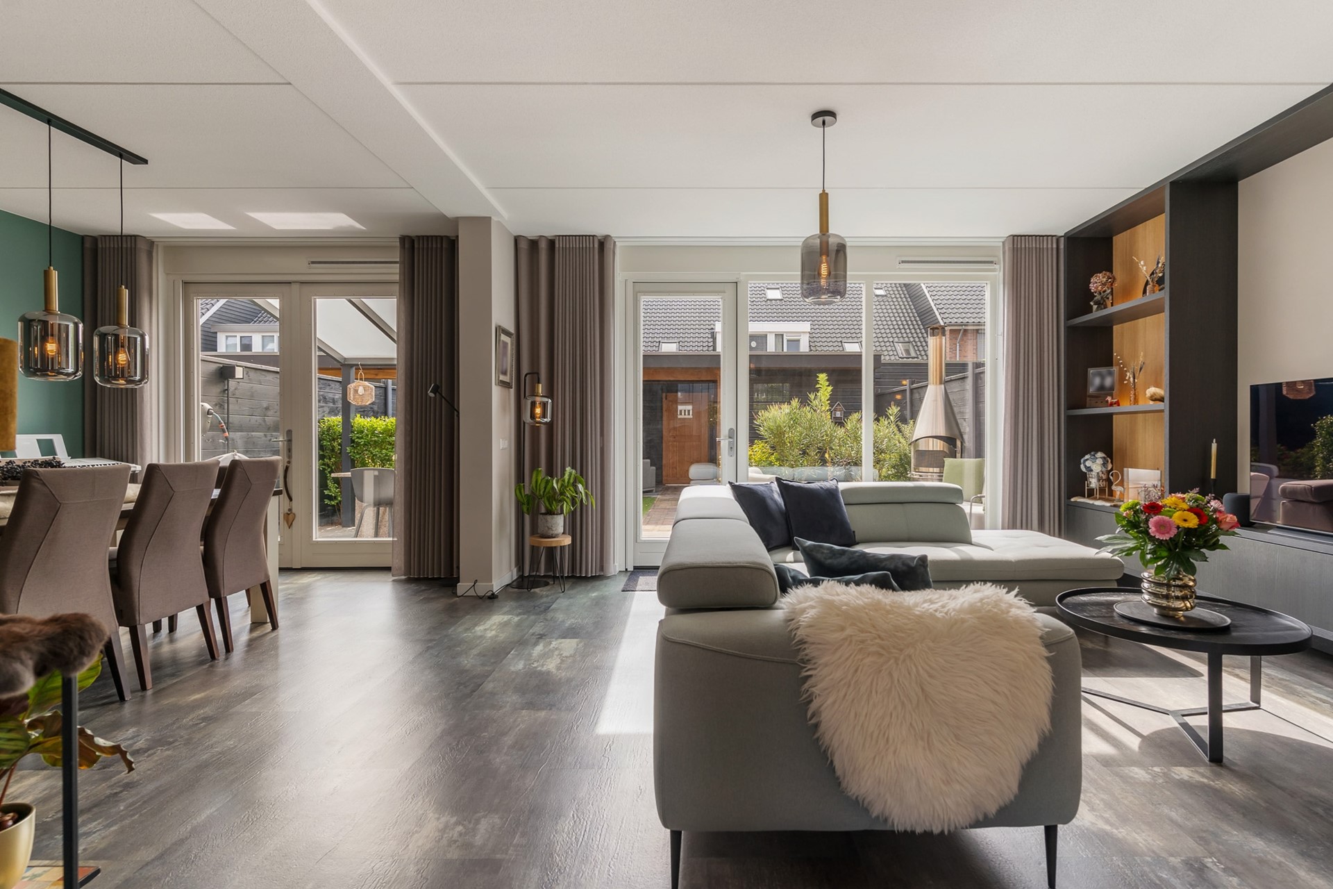 Je komt binnen in een nette, lichte hal met direct toegang tot het moderne toilet. Ook bevindt zich hier de meterkast die voorzien is van 3-fase en een wateronthardingssysteem. Vanuit hier stap je de royale woonkamer binnen: een heerlijke leefruimte met grote raampartijen en openslaande deuren naar de tuin. De verbinding tussen binnen en buiten is hierdoor zeer aangenaam. Aan de achterzijde is de woonkamer 8 meter breed Hierdoor is er meer dan genoeg ruimte voor een zithoek en een eethoek. Zowel de woonkamer als de eetkamer zijn voorzien van hoogwaardige, ruime inbouwkasten.