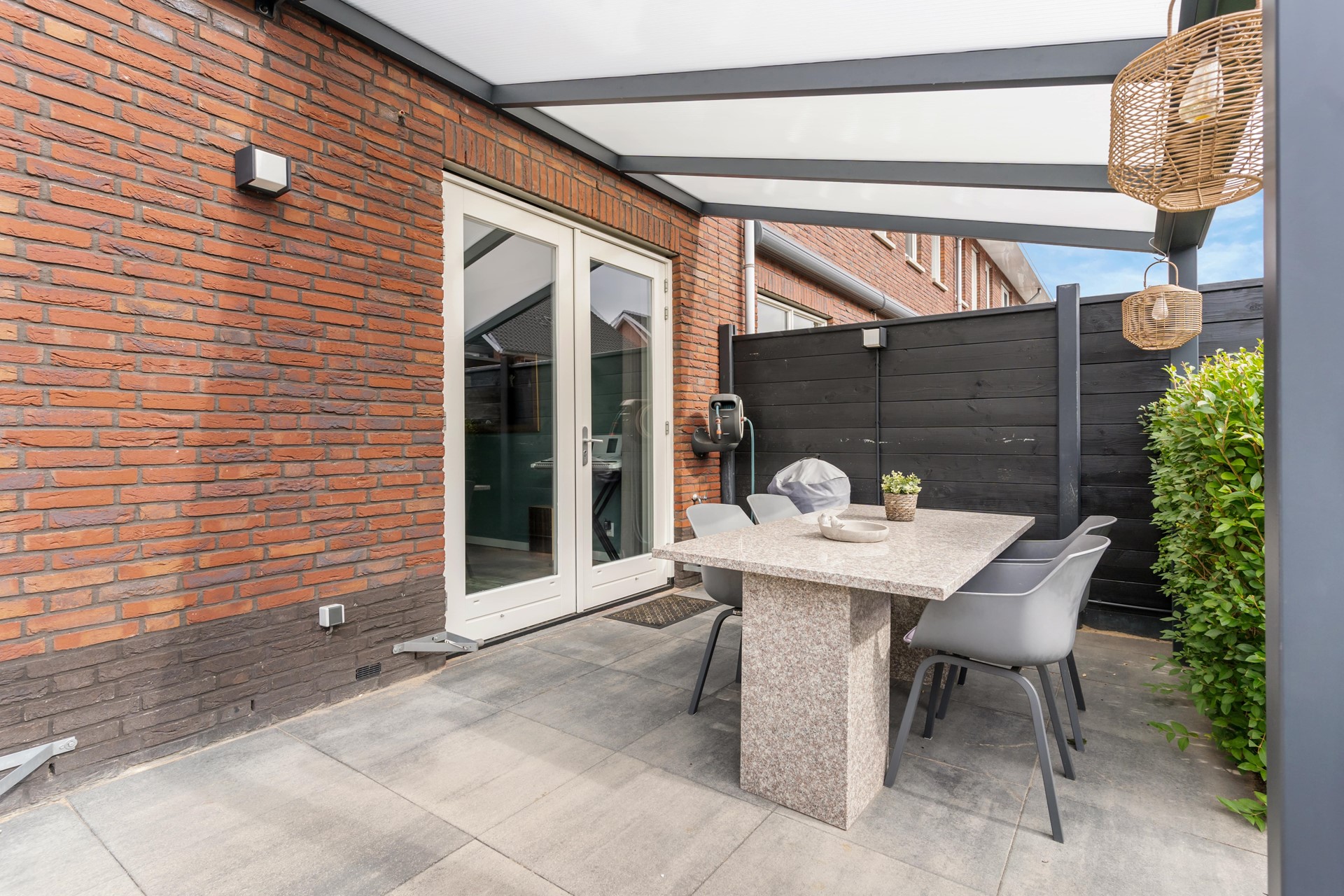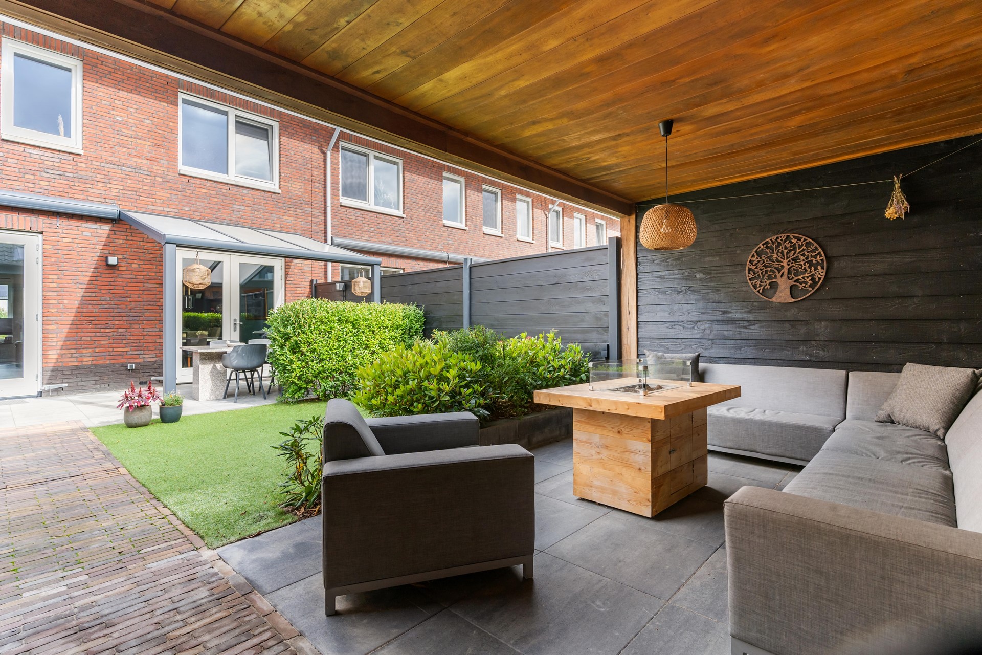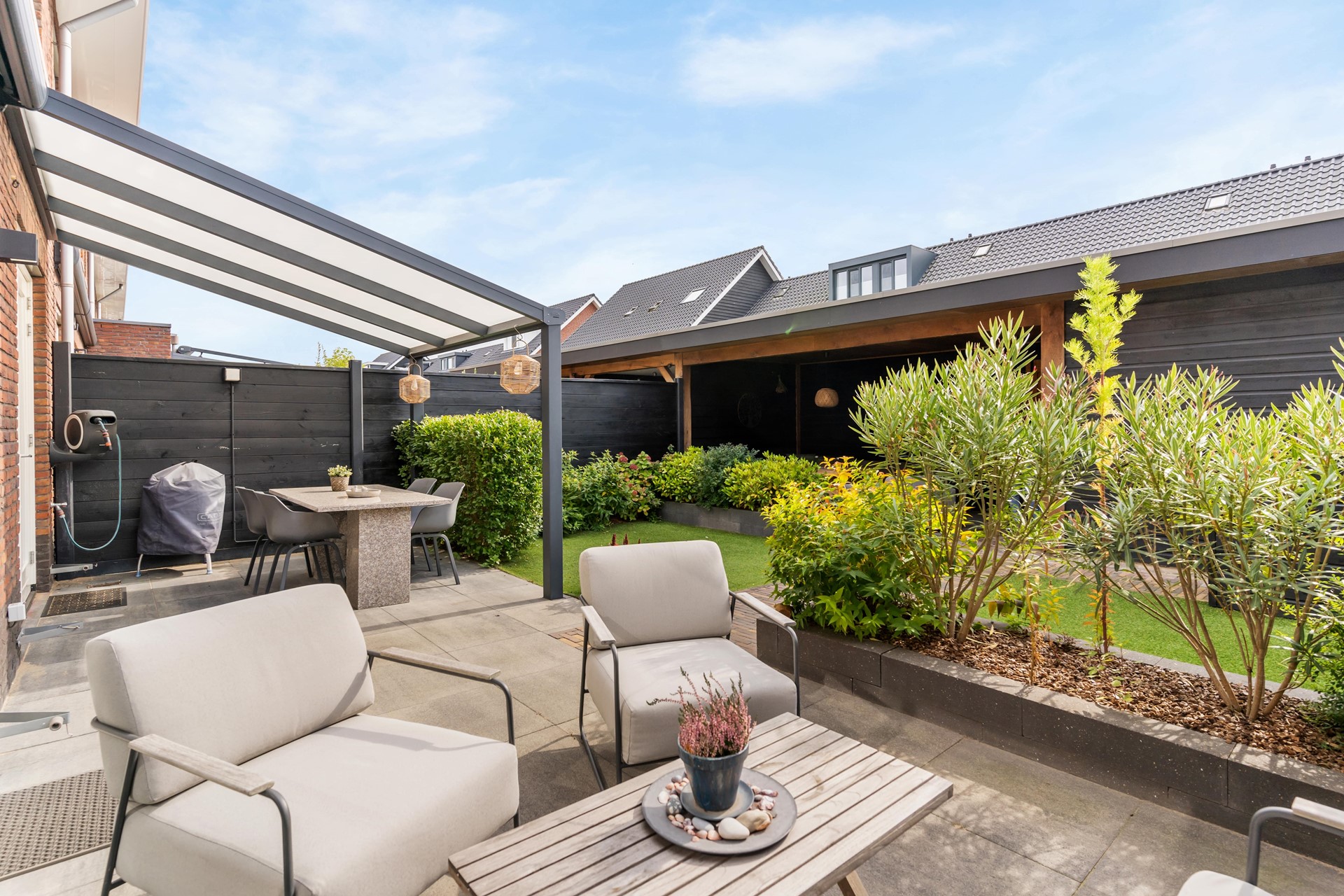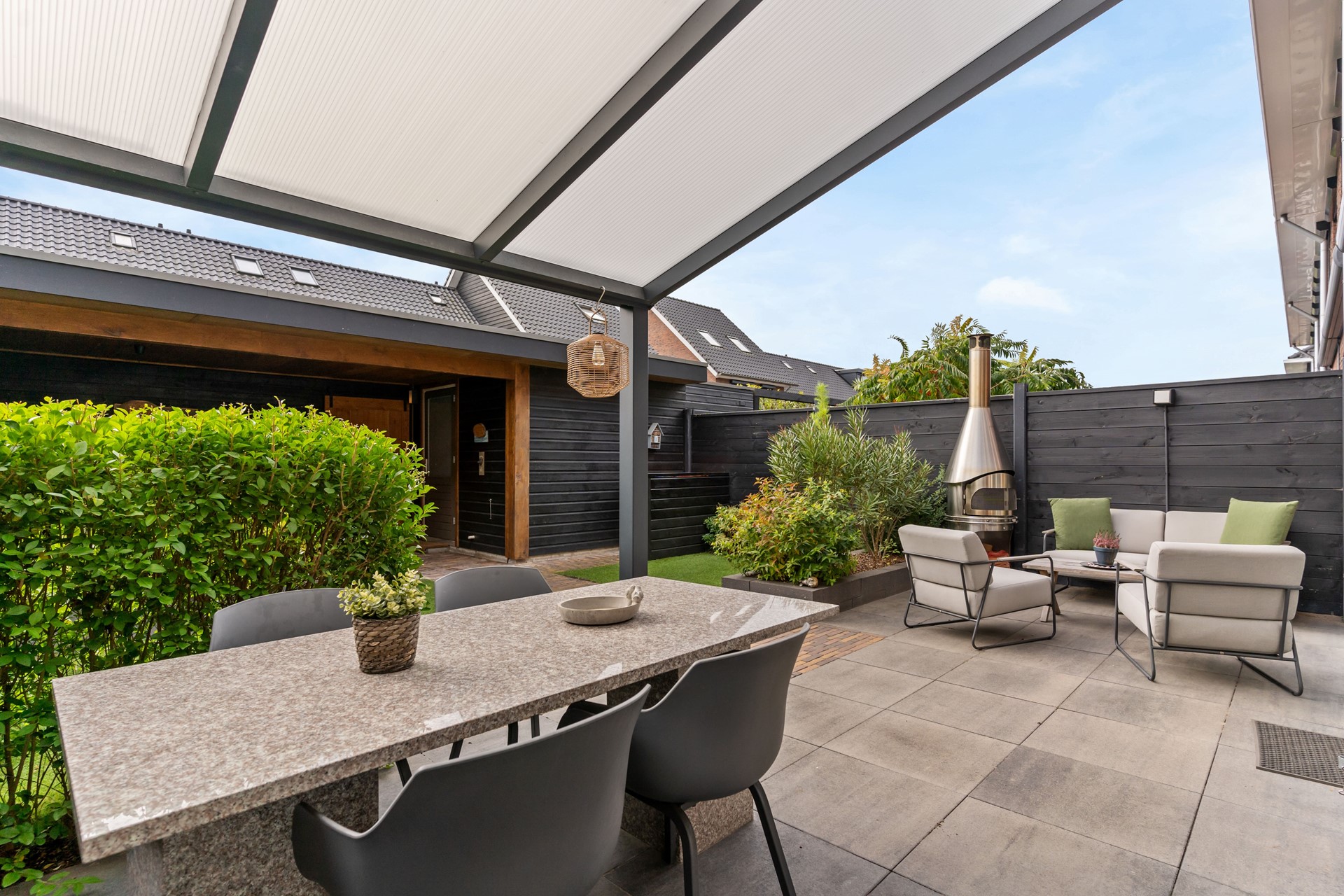 En dan natuurlijk de tuin: zonnig, liggend op het zuiden, onderhoudsvriendelijk én voorzien van een sfeervolle overkapping gekoppeld aan de berging. Ook in de winter kun je genieten van de buitenruimte. Aan het huis staat een stijlvolle tweede overkapping waar je heerlijk onder kunt eten als je daar je tuintafel zou zetten. De planten zijn winterhard en makkelijk in onderhoud en in elk seizoen bloeien er planten. Aan beide zijden van de tuin is een stevige erfafscheiding met betonpalen en houten delen.