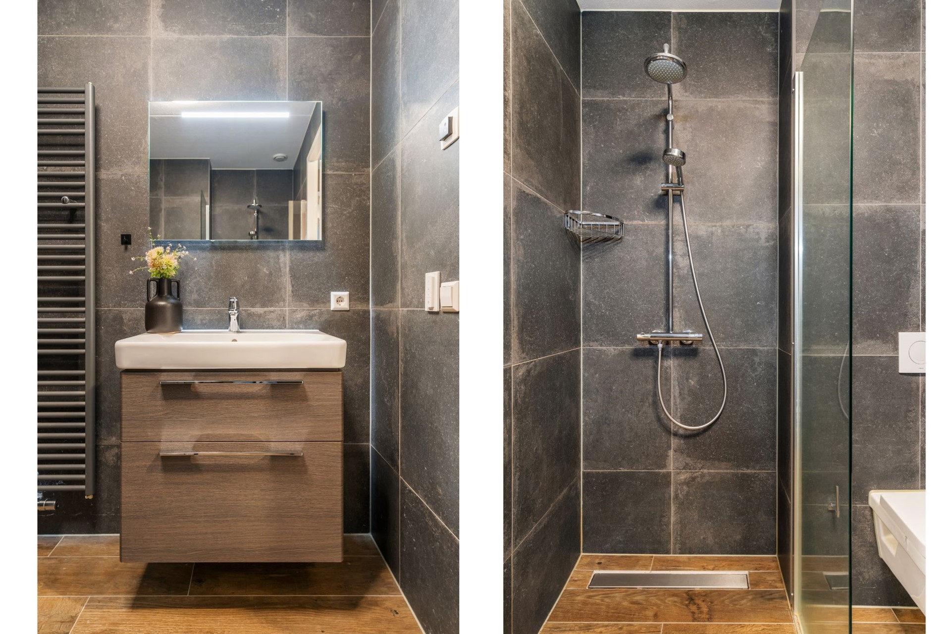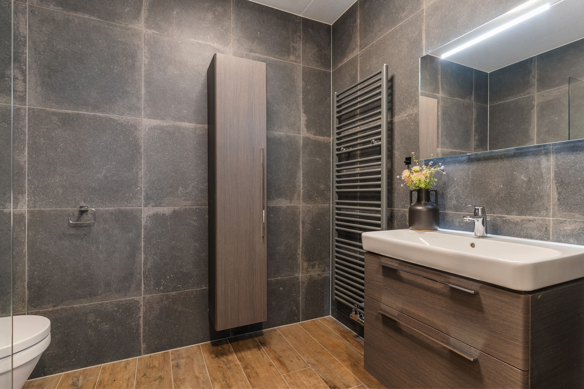 De badkamer is uitgevoerd in een moderne, luxe stijl en voorzien van een inloopdouche met handdouche en regendouche, wastafel met wasmeubel, een badkamerkast en zwevend toilet.