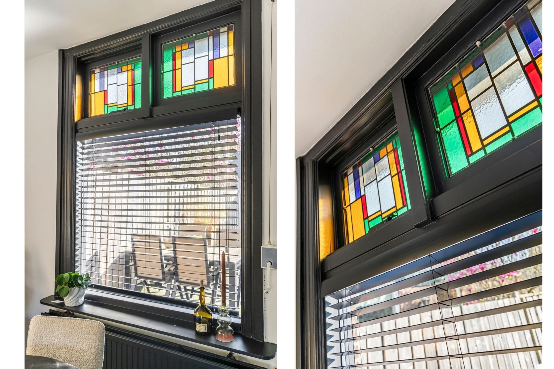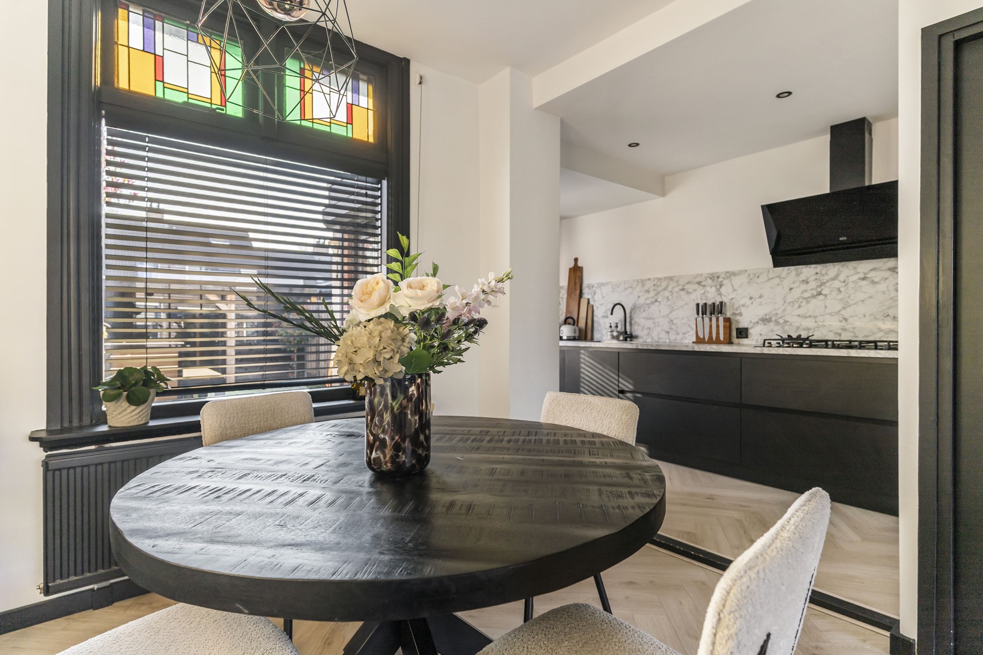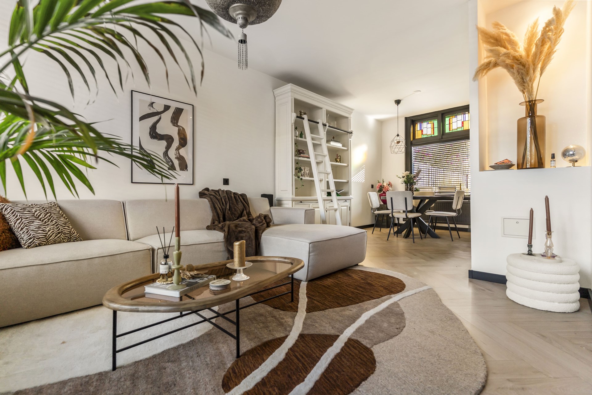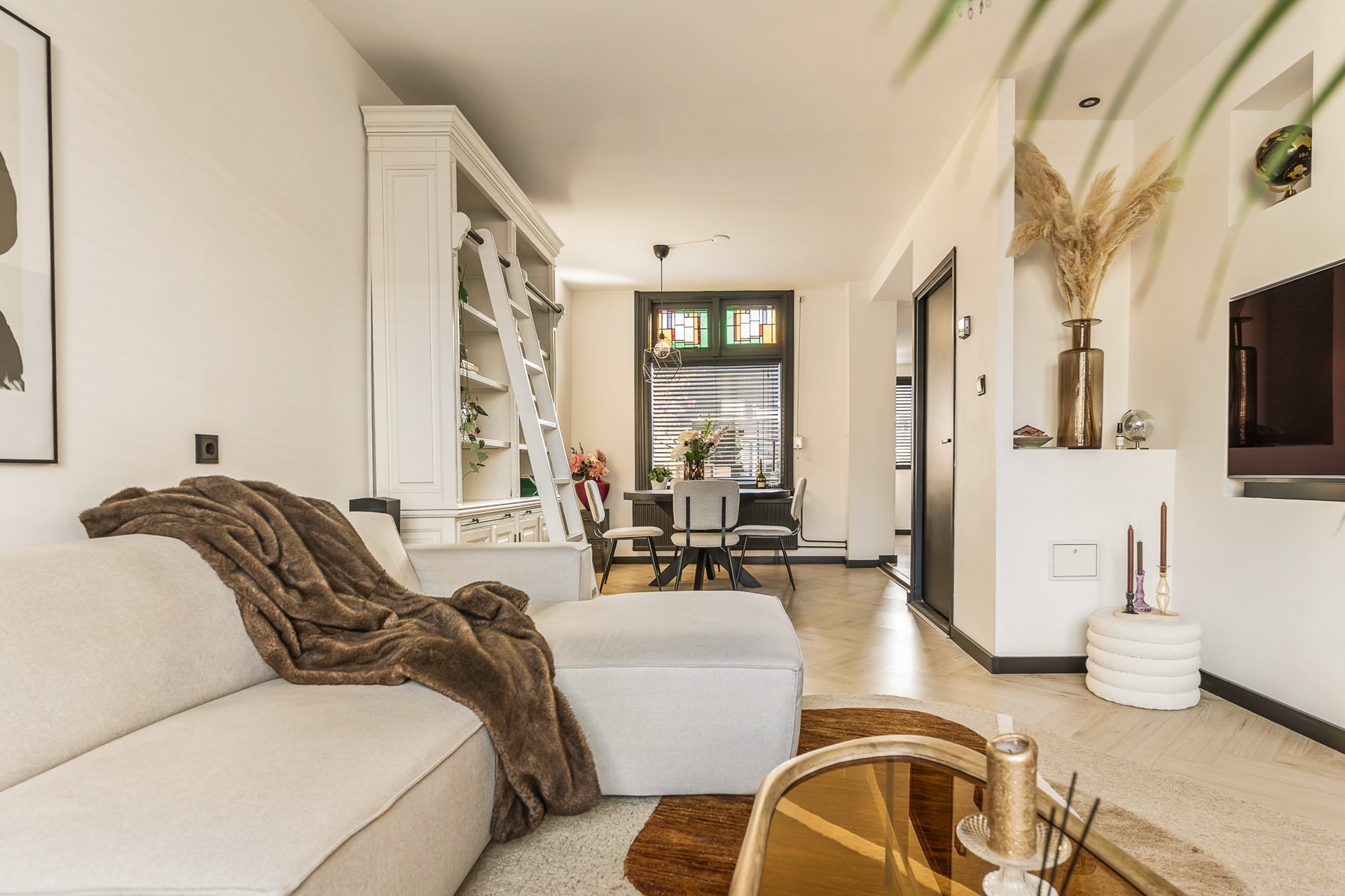 De woonkamer is voorzien van een strakke cinewall met inbouwspotjes en pvc-visgraatvloer. Dankzij de grote raampartijen valt er voldoende natuurlijk licht de woning binnen en zorgen de authentieke glas-in-lood-ramen voor een geweldige sfeer.