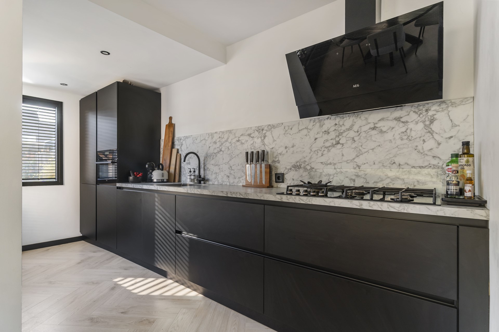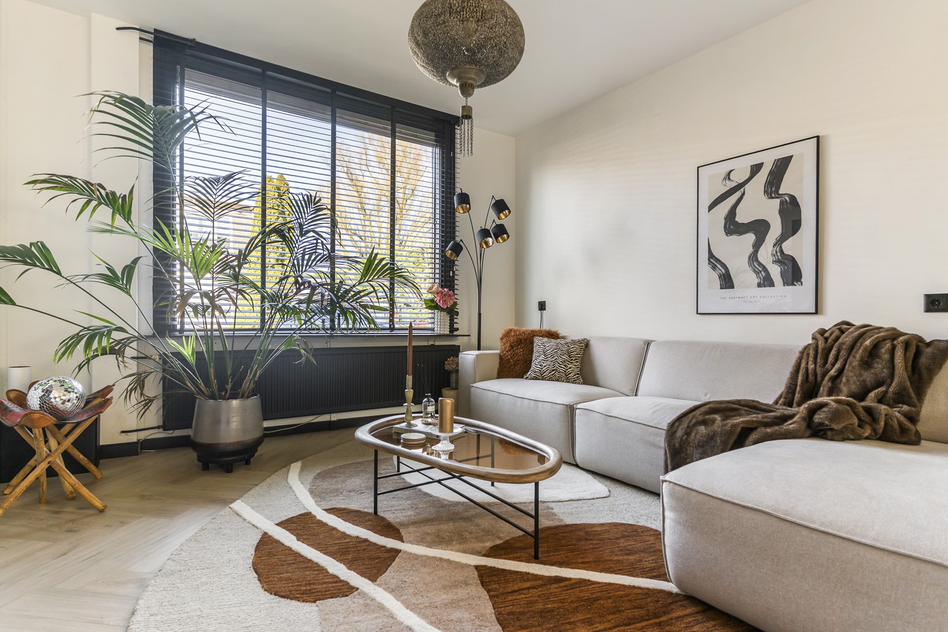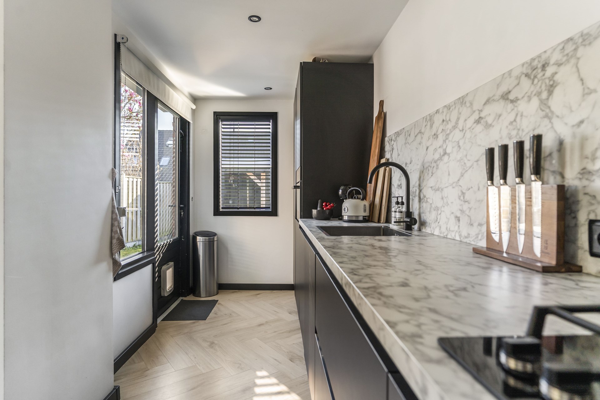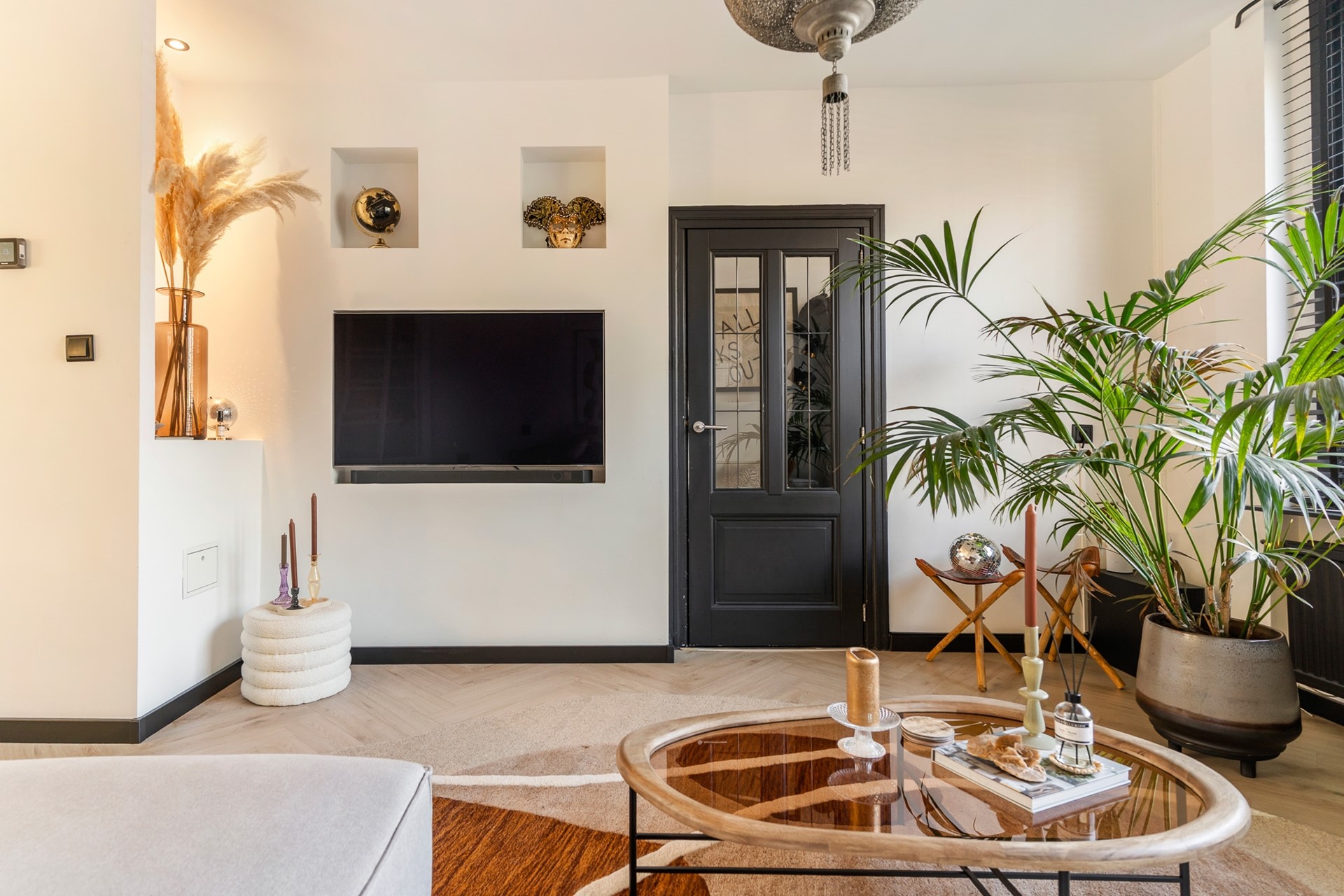 De woonkamer is voorzien van een strakke cinewall met inbouwspotjes en pvc-visgraatvloer. Dankzij de grote raampartijen valt er voldoende natuurlijk licht de woning binnen en zorgen de authentieke glas-in-lood-ramen voor een geweldige sfeer.