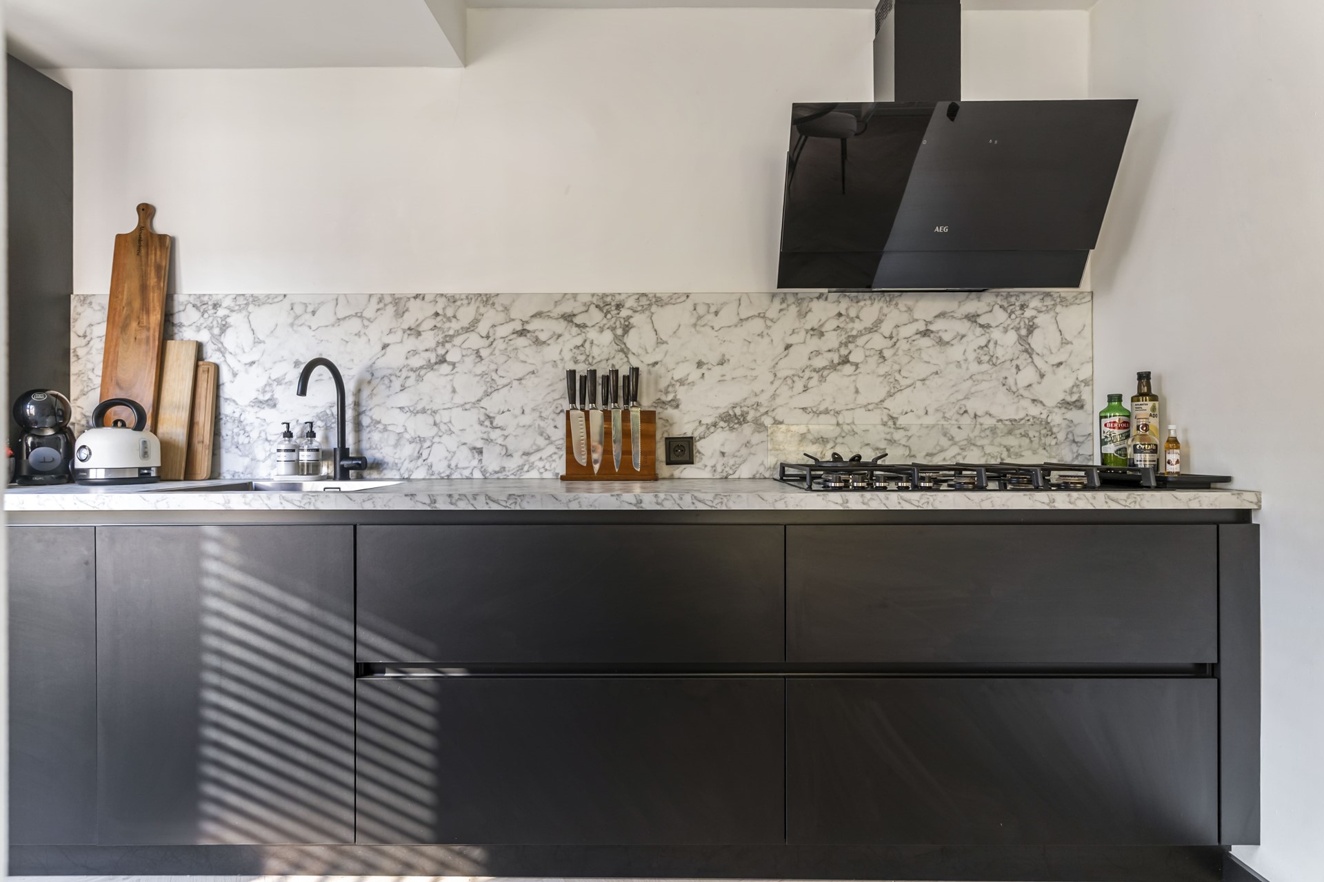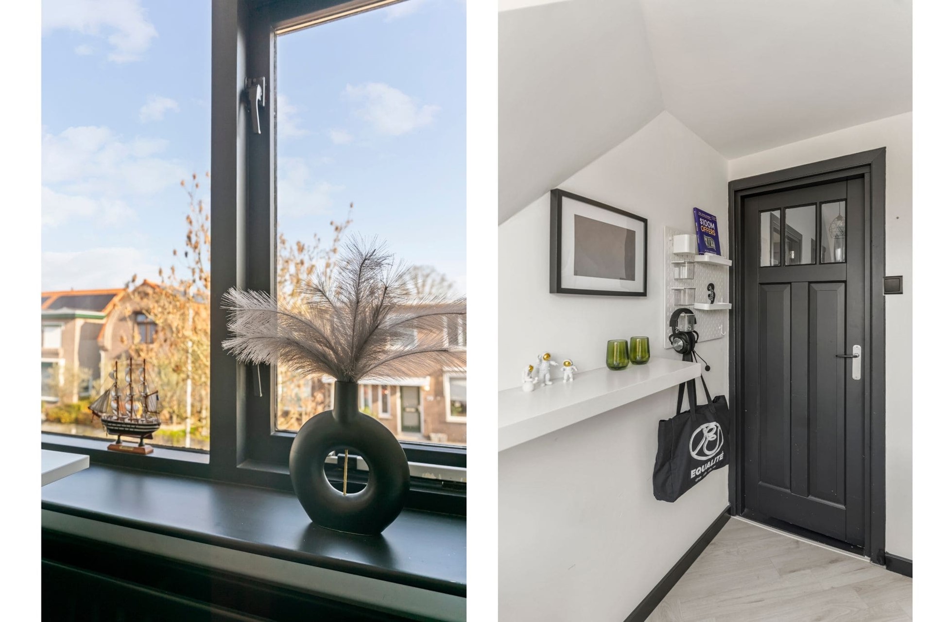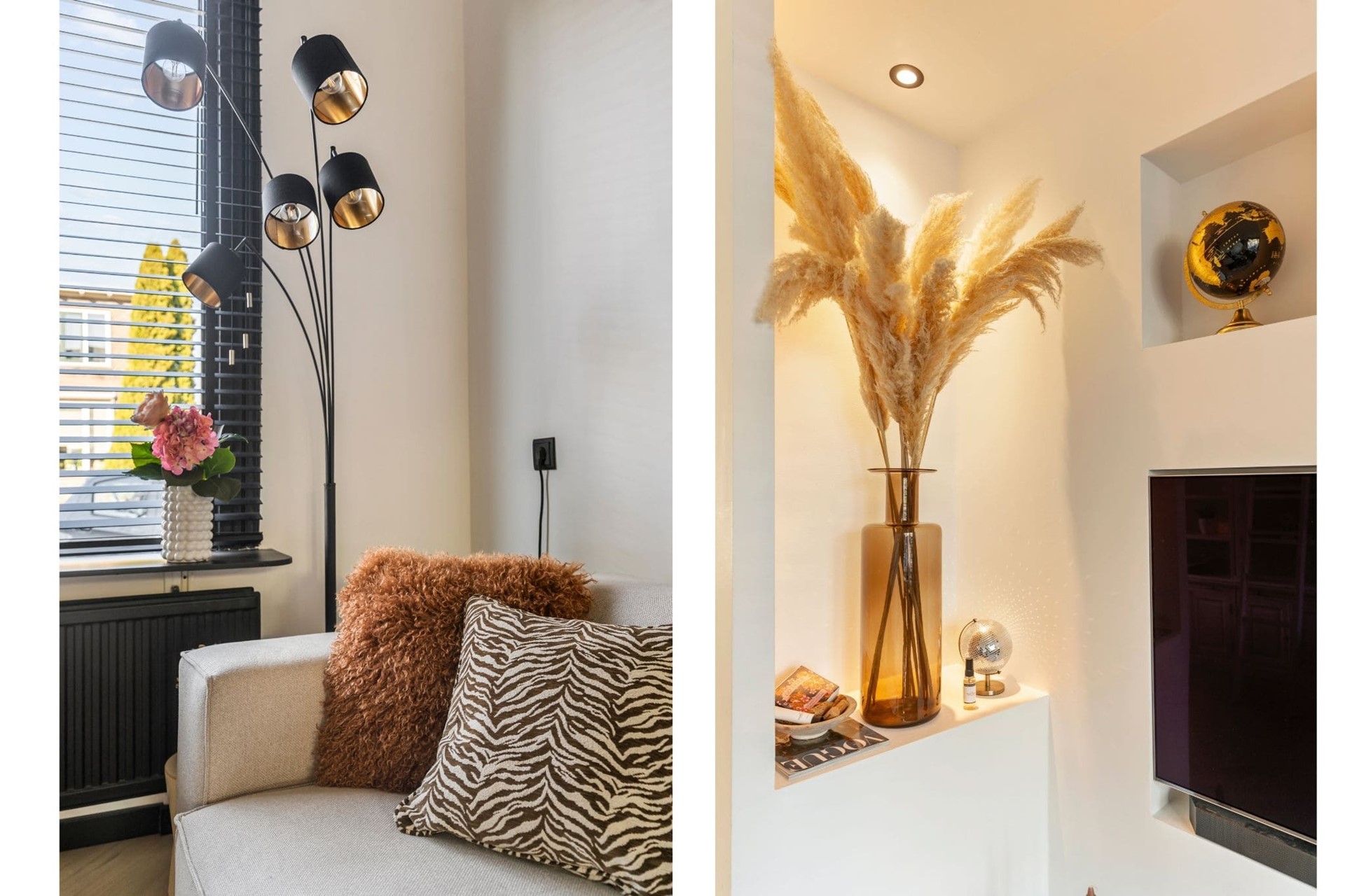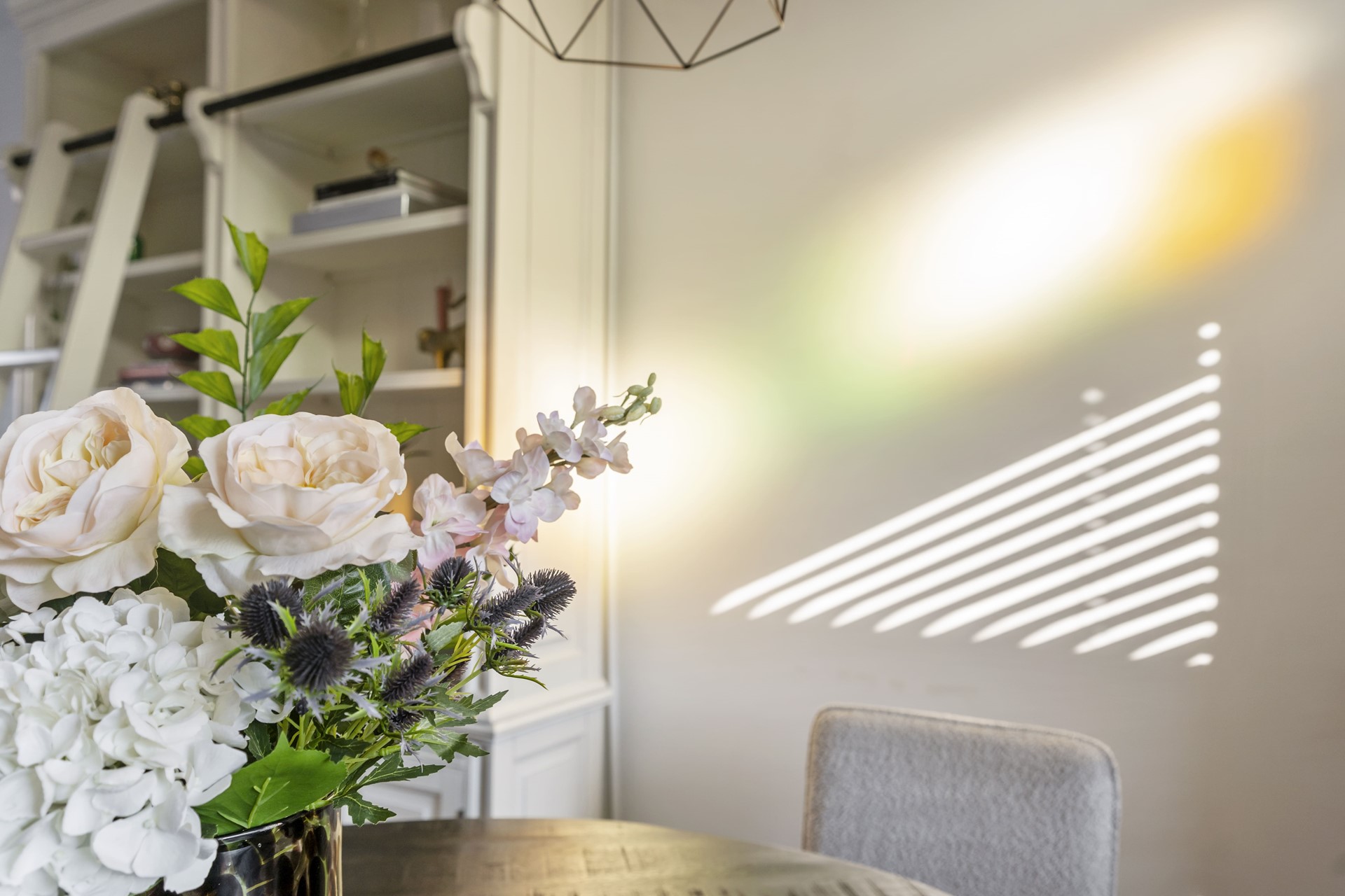 De woonkamer is voorzien van een strakke cinewall met inbouwspotjes en pvc-visgraatvloer. Dankzij de grote raampartijen valt er voldoende natuurlijk licht de woning binnen en zorgen de authentieke glas-in-lood-ramen voor een geweldige sfeer.