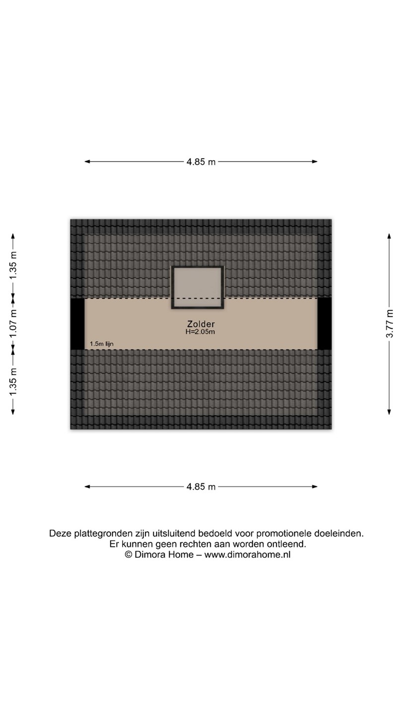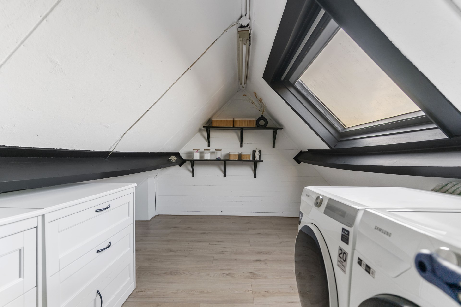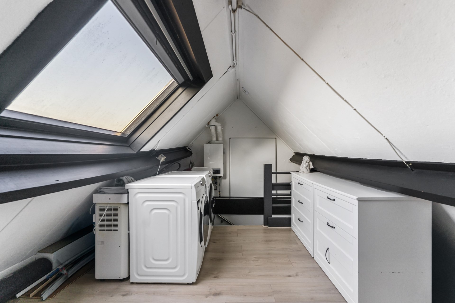De open zolder beschikt over de aansluiting voor de wasmachine en droger. Deze ruimte is ideaal te gebruiken als opbergzolder.