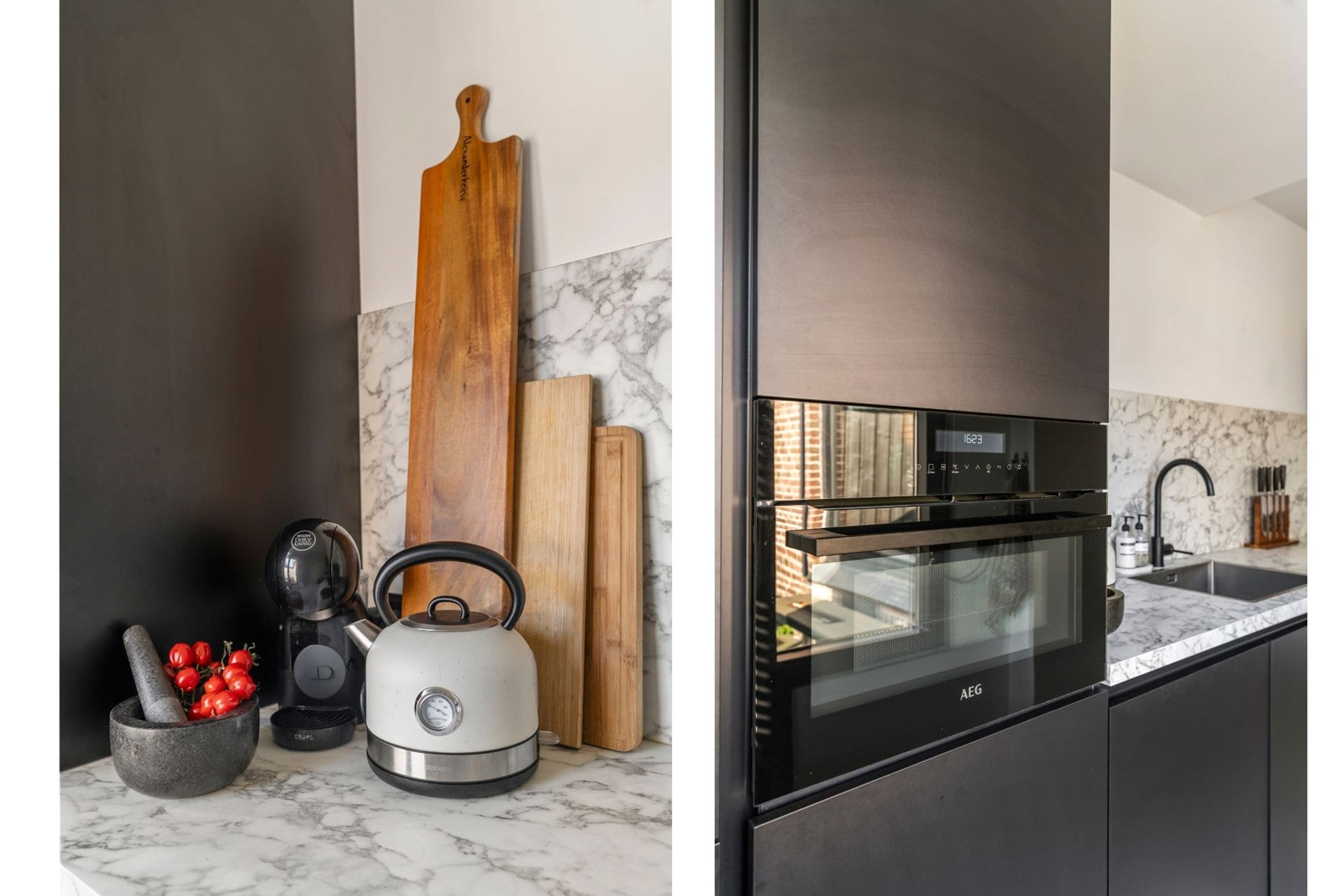 De half open keuken is modern uitgevoerd met onder andere een wasbak, vierpits-gasfornuis met afzuigkap, combi-magnetron, vaatwasser en koel-vriescombinatie. Het raam bij het eetgedeelte is voorzien van een rolluik.