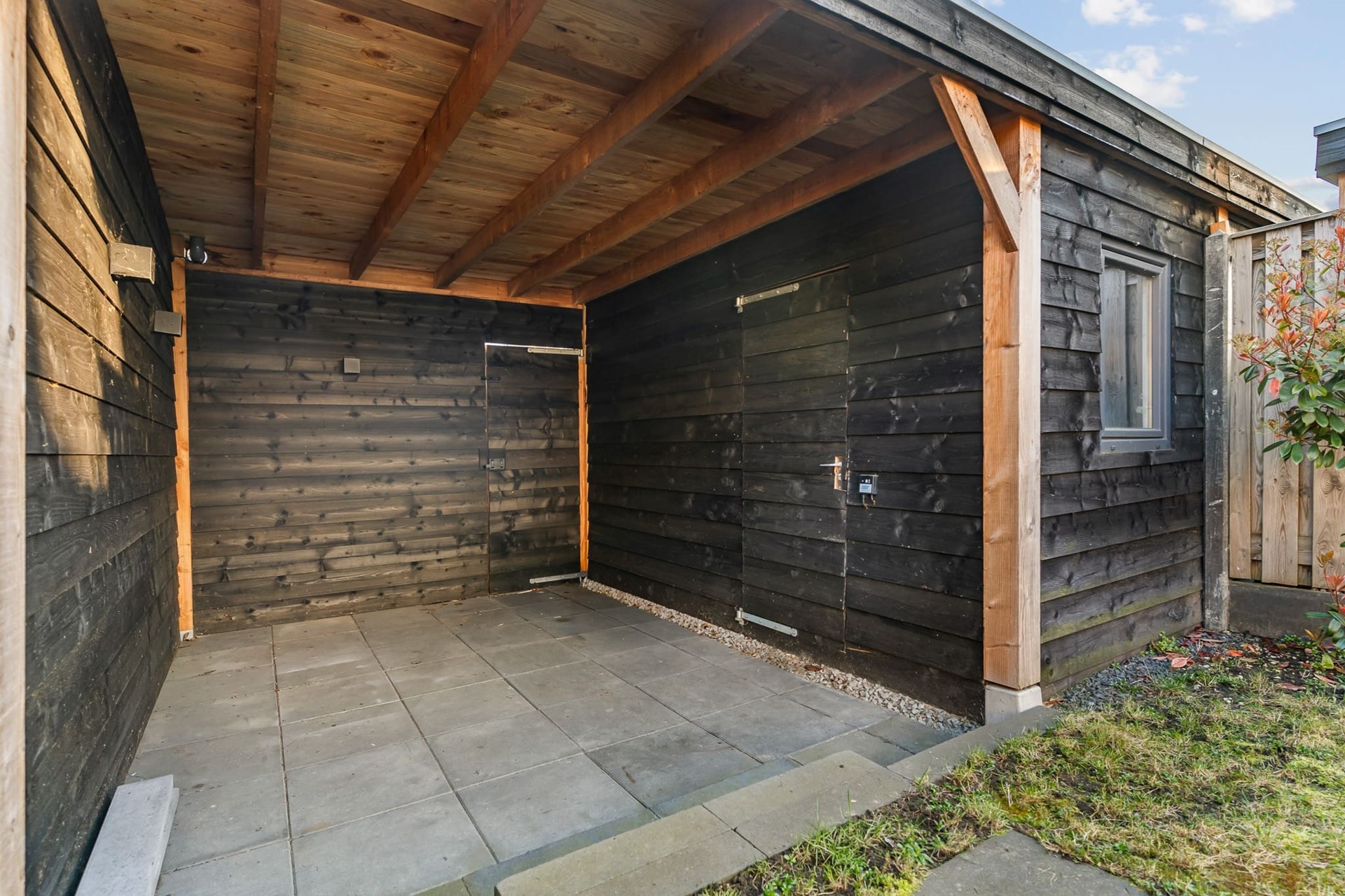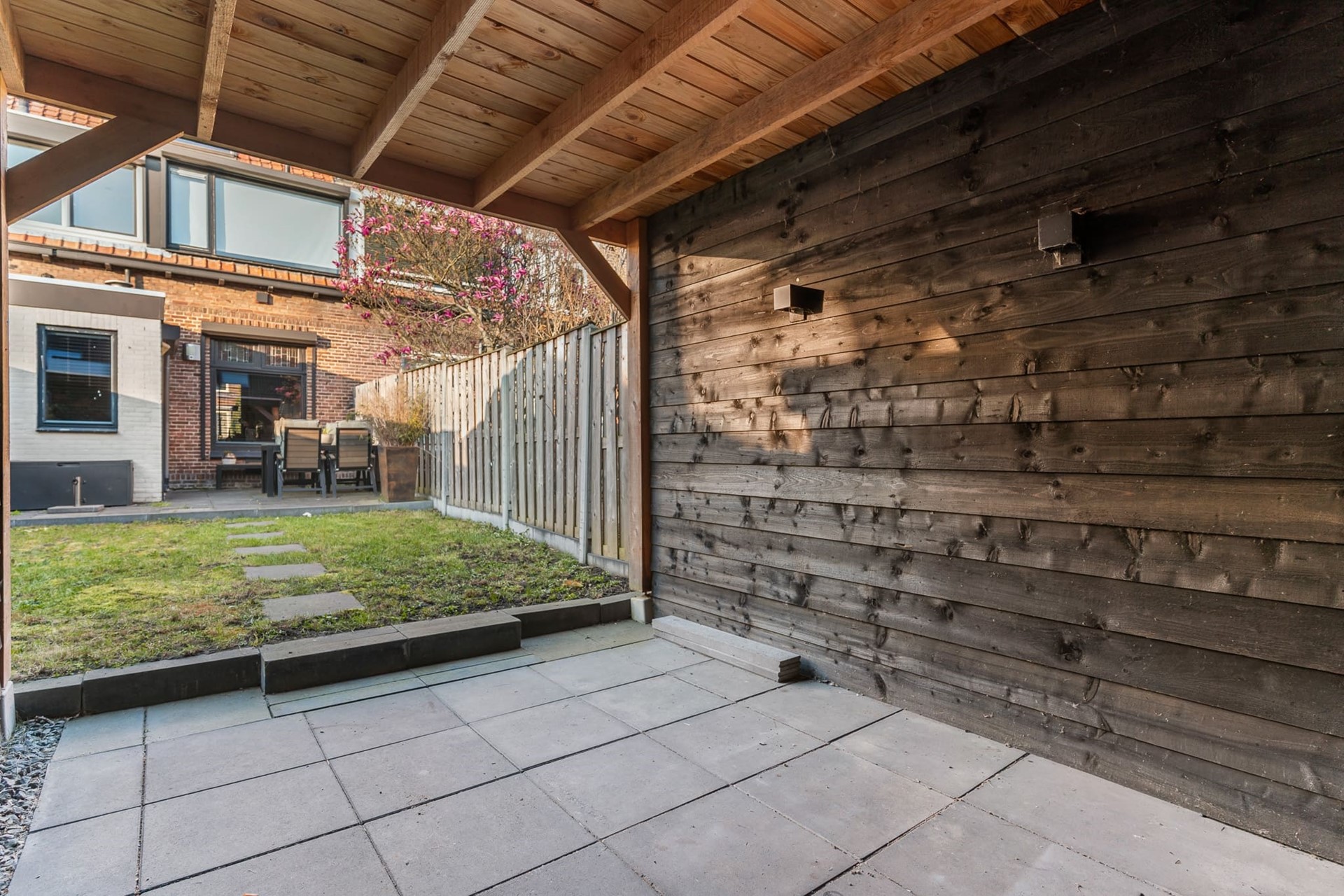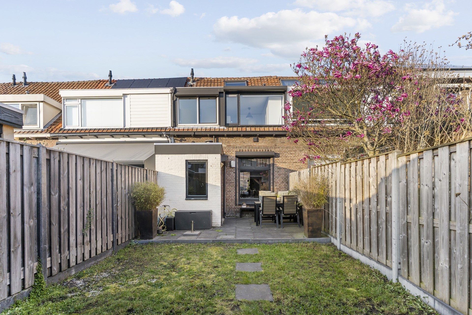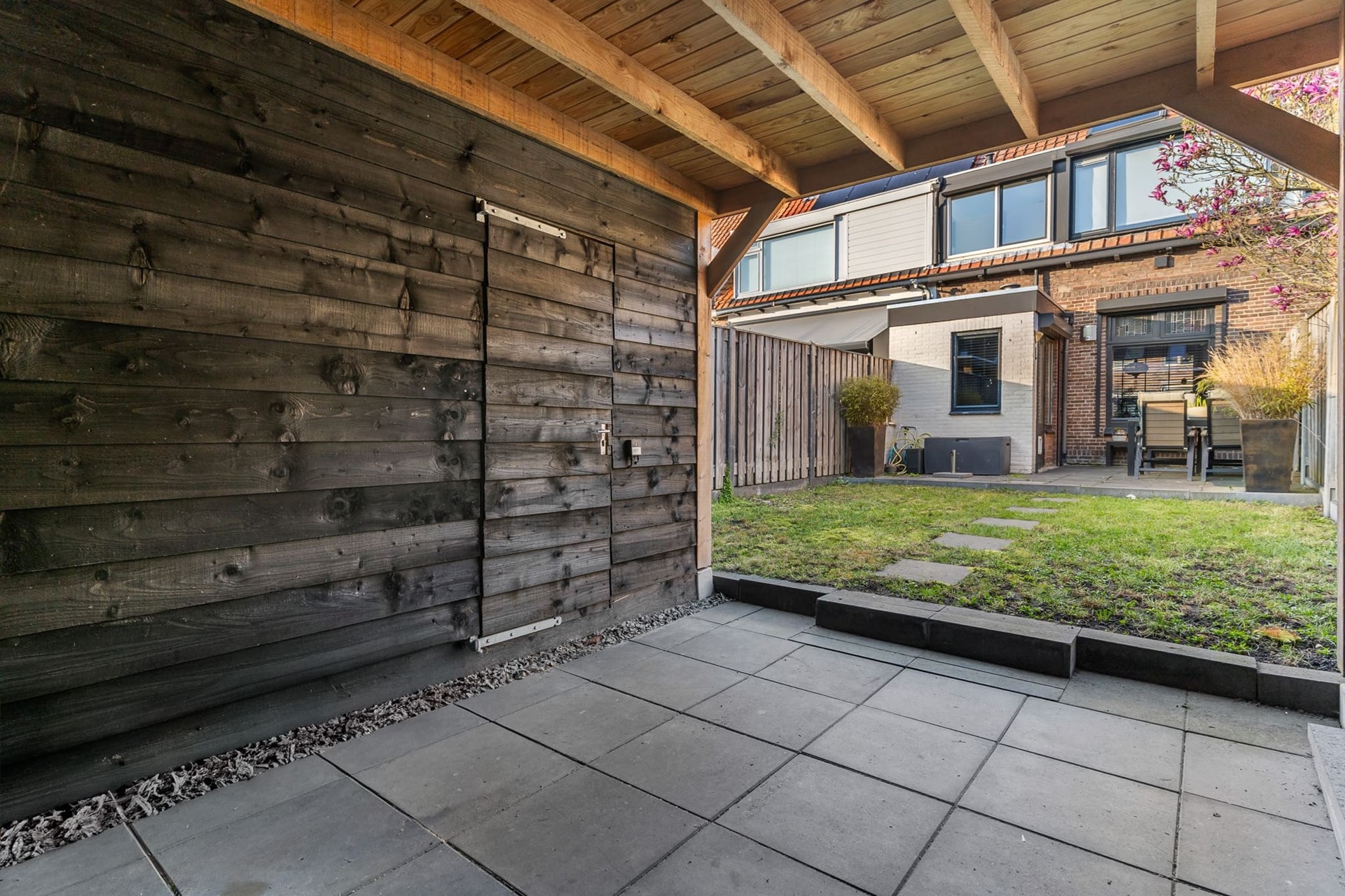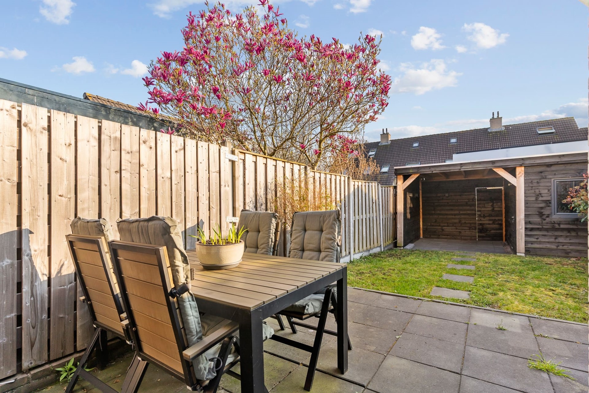 Vanuit de keuken is de achtertuin bereikbaar gelegen op het zonnige zuiden. De tuin is voorzien van een heerlijk zonneterras, een grasstrook en overkapping met schuur. Hier heeft u altijd een droog beschut plekje waar het ook heerlijk vertoeven is in de schaduw. Ook is er een achterom aanwezig.