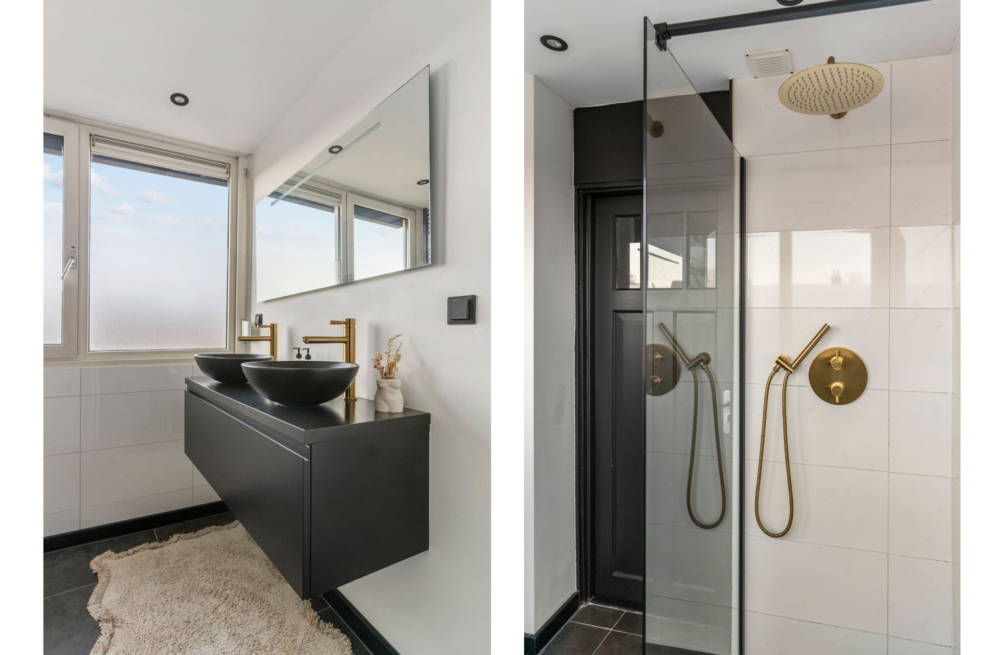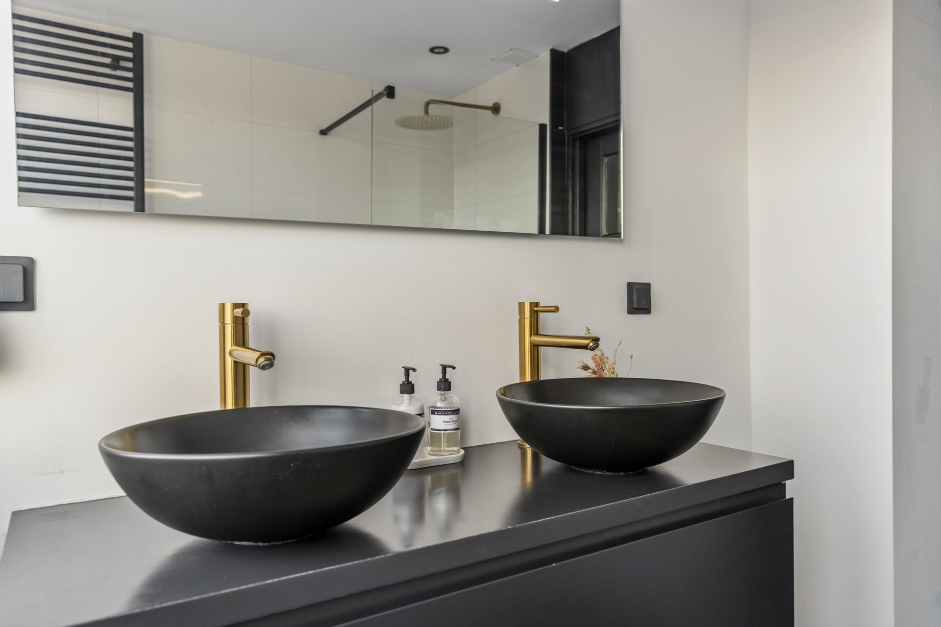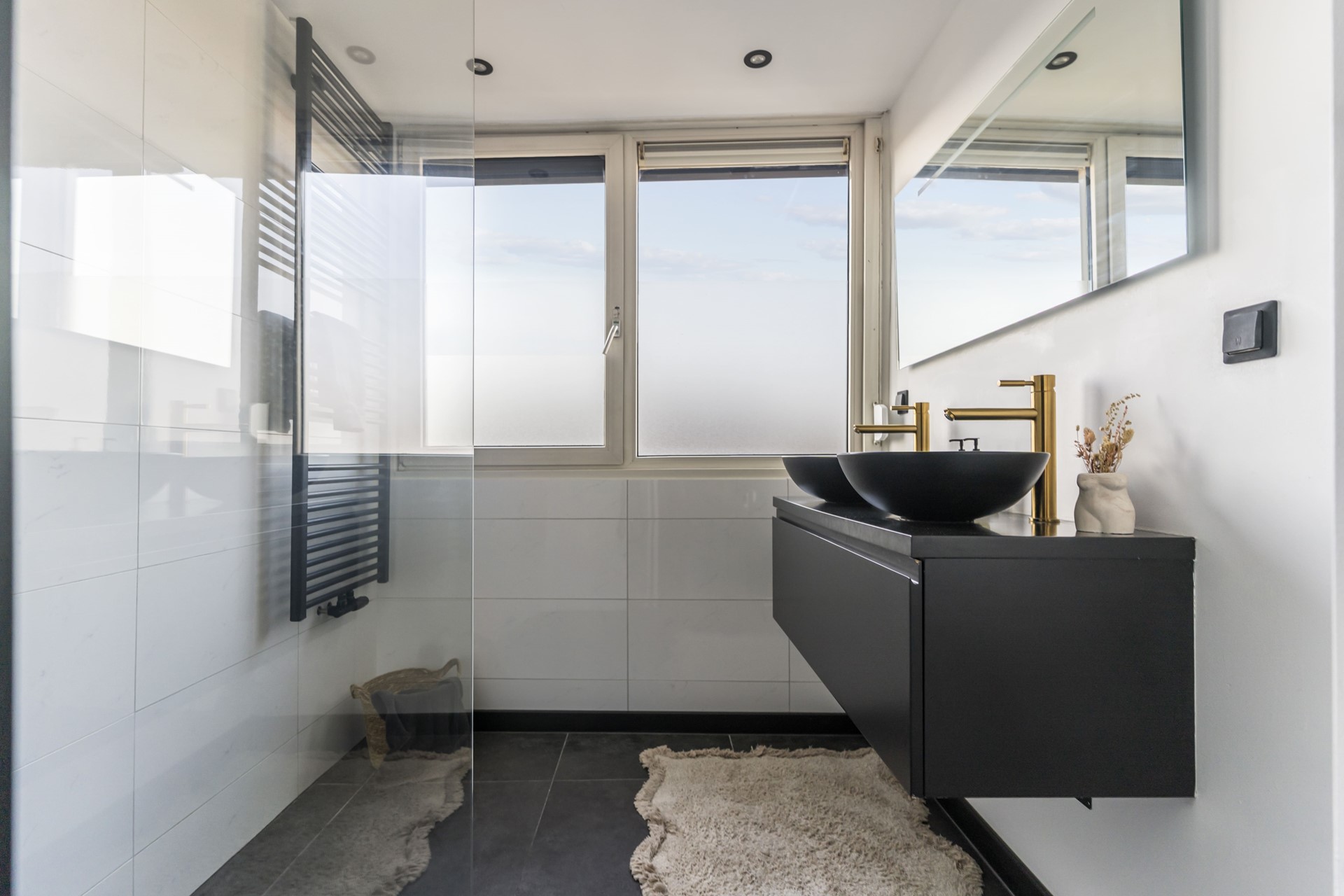 De badkamer beschikt over een dubbel wastafelmeubel met waskommen, een inloop regendouche en designradiator. Ook hier zit een rolluik.